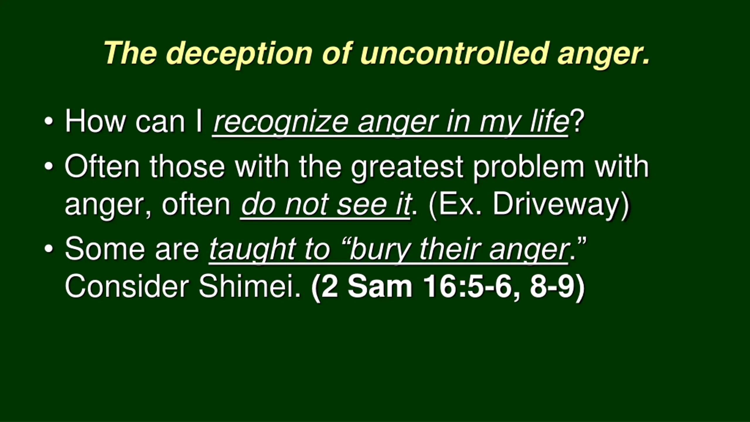 The deception of uncontrolled anger. How can I recognize anger in my life? Often those with the greatest problem with anger, often do not see it. (Ex. Driveway) Some are taught to bury their anger. Consider Shimei. (2 Sam 16:5-6, 8-9)