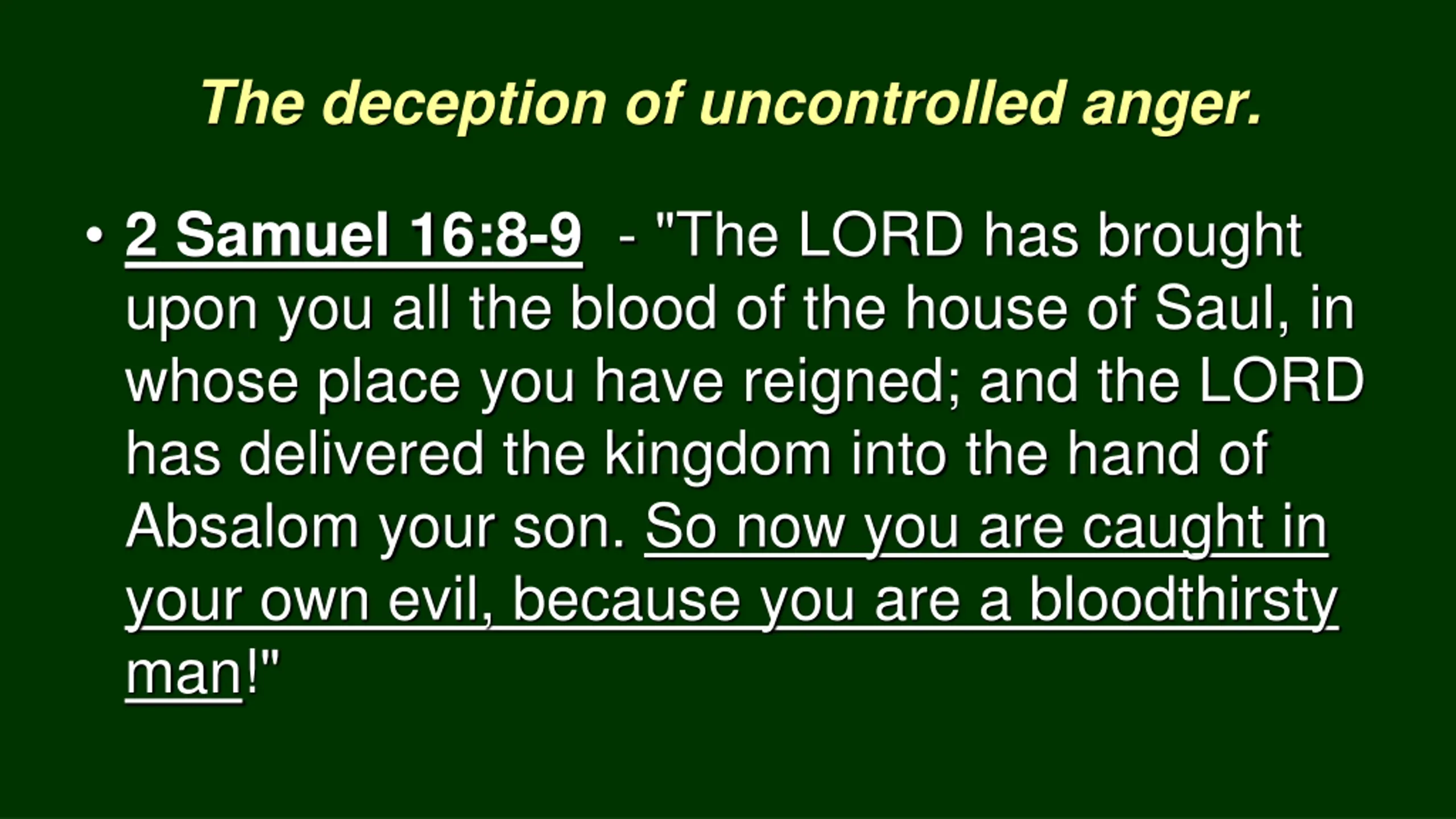 The deception of uncontrolled anger. 2 Samuel 16:8-9 - "The LORD has brought upon you all the blood of the house of Saul, in whose place you have reigned; and the LORD has delivered the kingdom into the hand of Absalom your son. So now you are caught in your own evil, because you are a bloodthirsty man!"