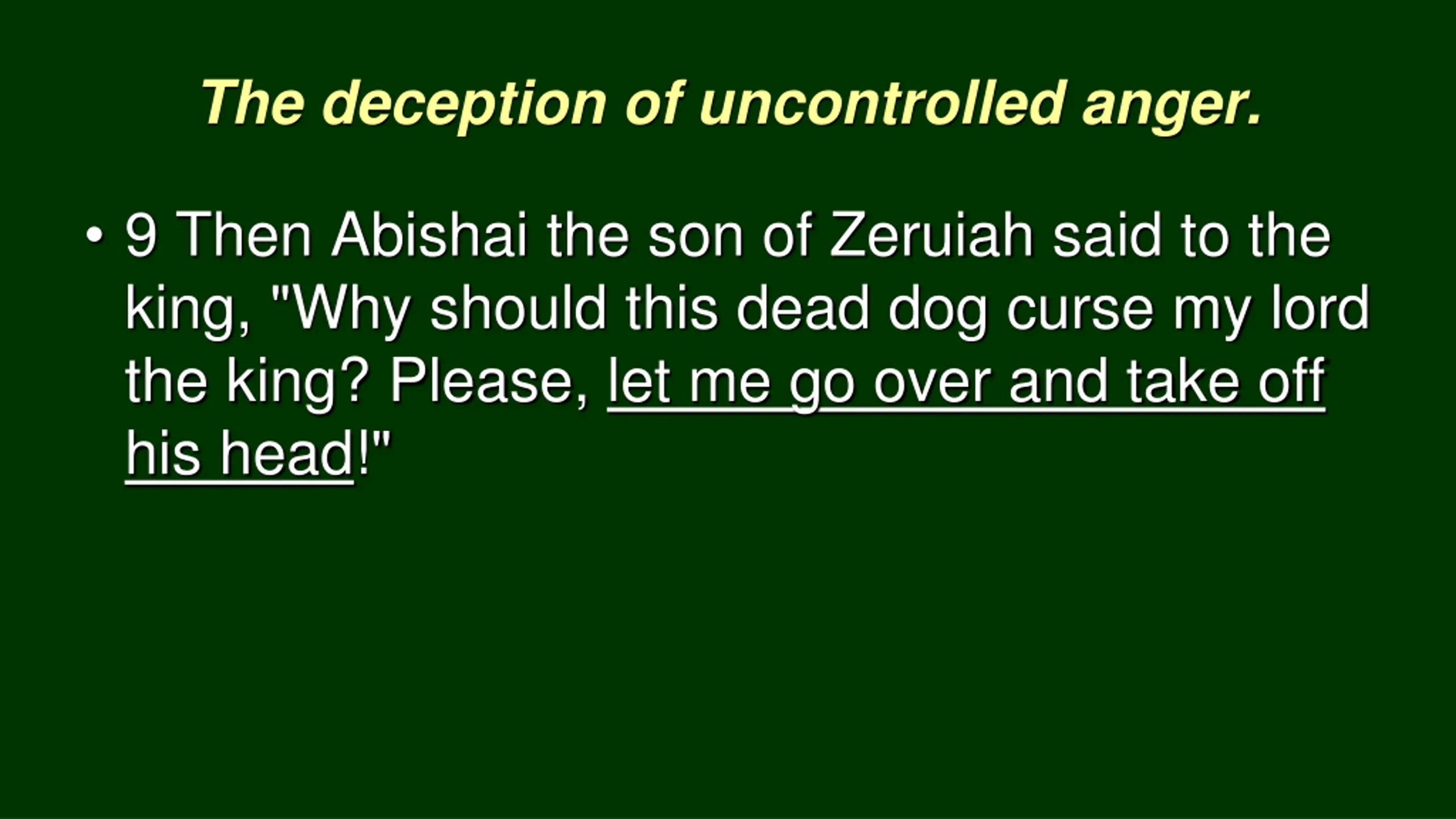 The deception of uncontrolled anger. 9 Then Abishai the son of Zeruiah said to the king, "Why should this dead dog curse my lord the king? Please, let me go over and take off his head!"