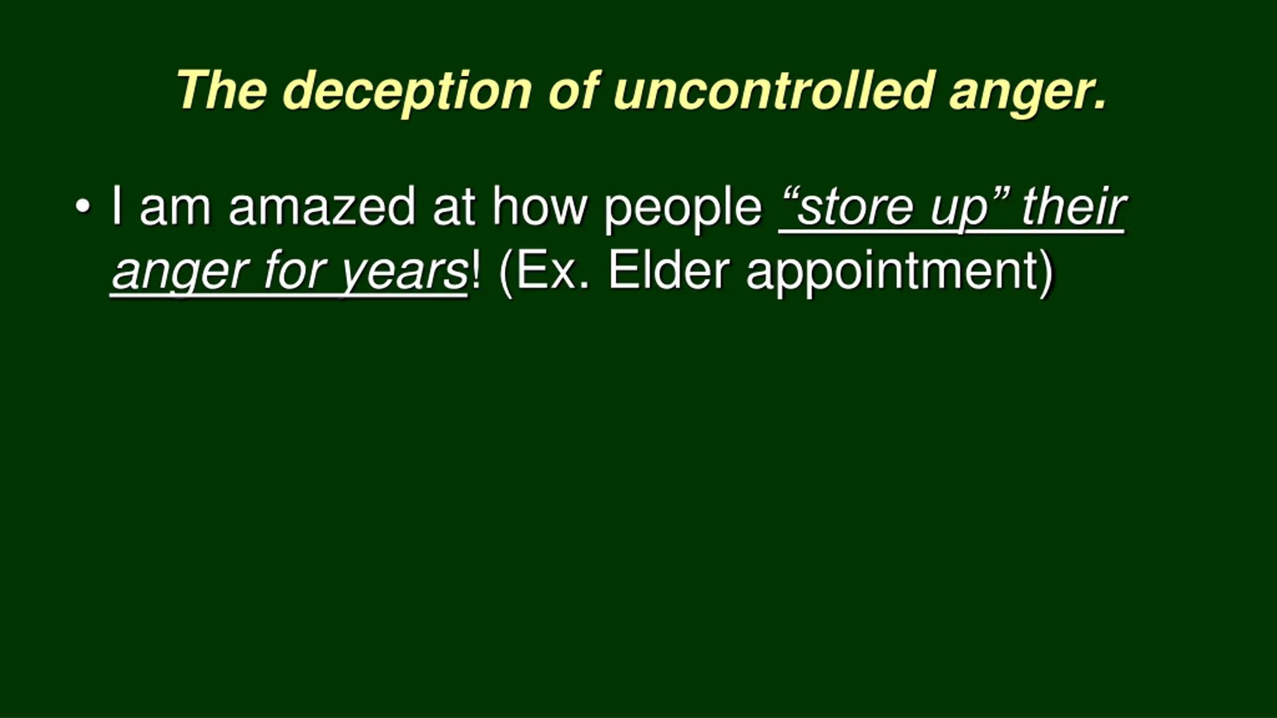 The deception of uncontrolled anger. I am amazed at how people store up their anger for years! (Ex. Elder appointment)