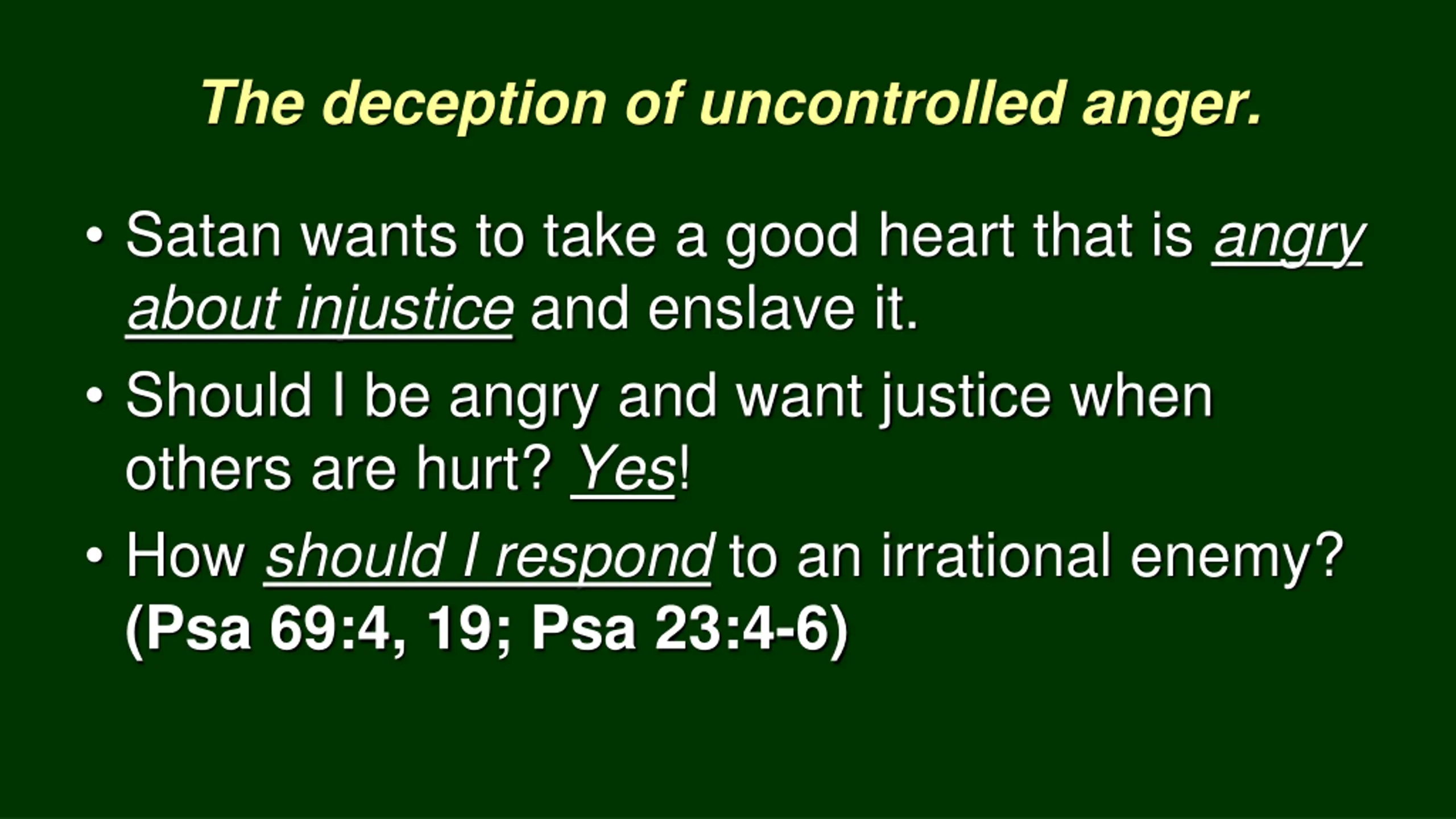 The deception of uncontrolled anger. Satan wants to take a good heart that is angry about injustice and enslave it. Should I be angry and want justice when others are hurt? Yes! How should I respond to an irrational enemy? (Psa 69:4, 19; Psa 23:4-6)