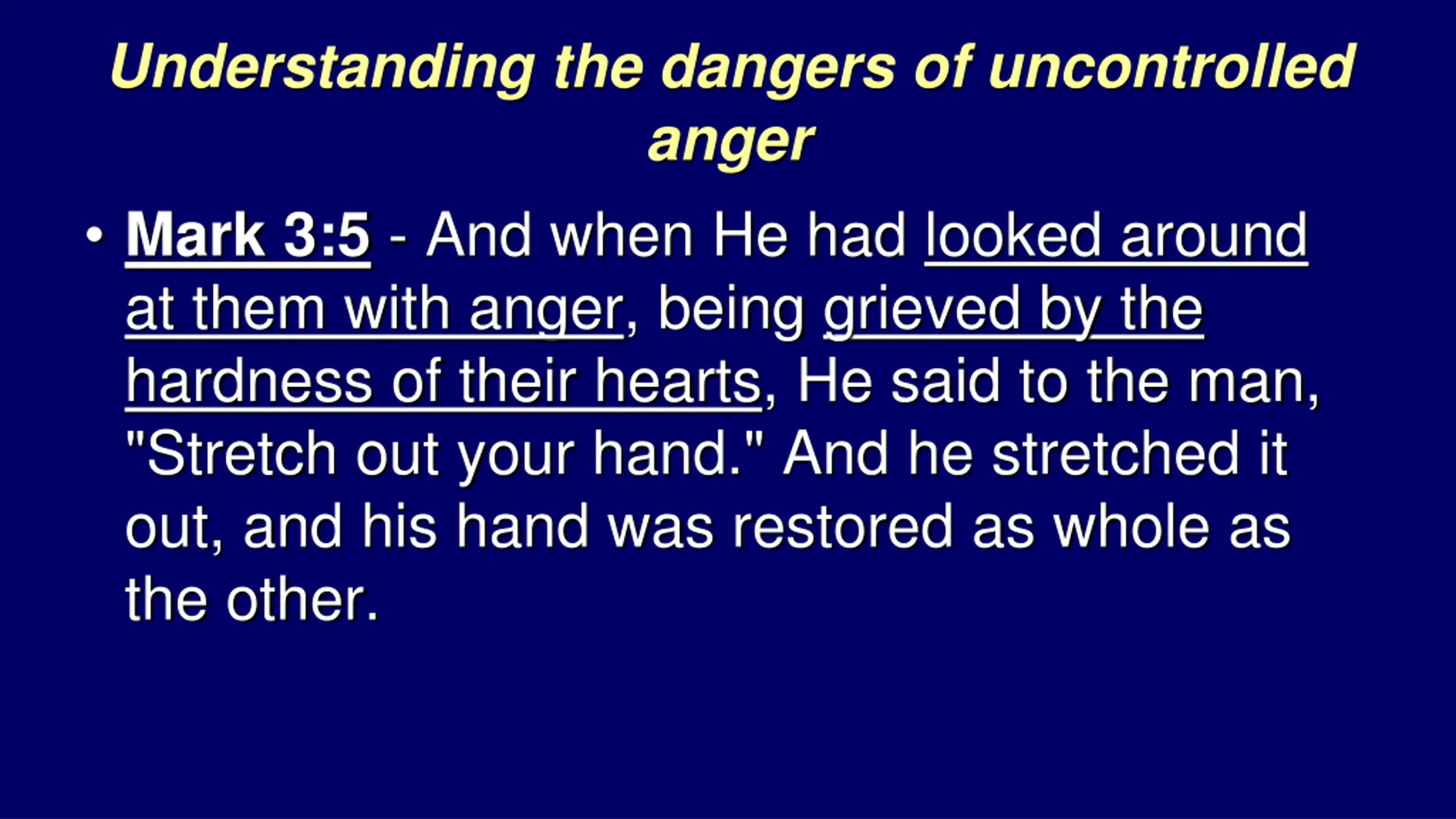 Understanding the dangers of uncontrolled anger Mark 3:5 - And when He had looked around at them with anger, being grieved by the hardness of their hearts, He said to the man, "Stretch out your hand." And he stretched it out, and his hand was restored as whole as the other.