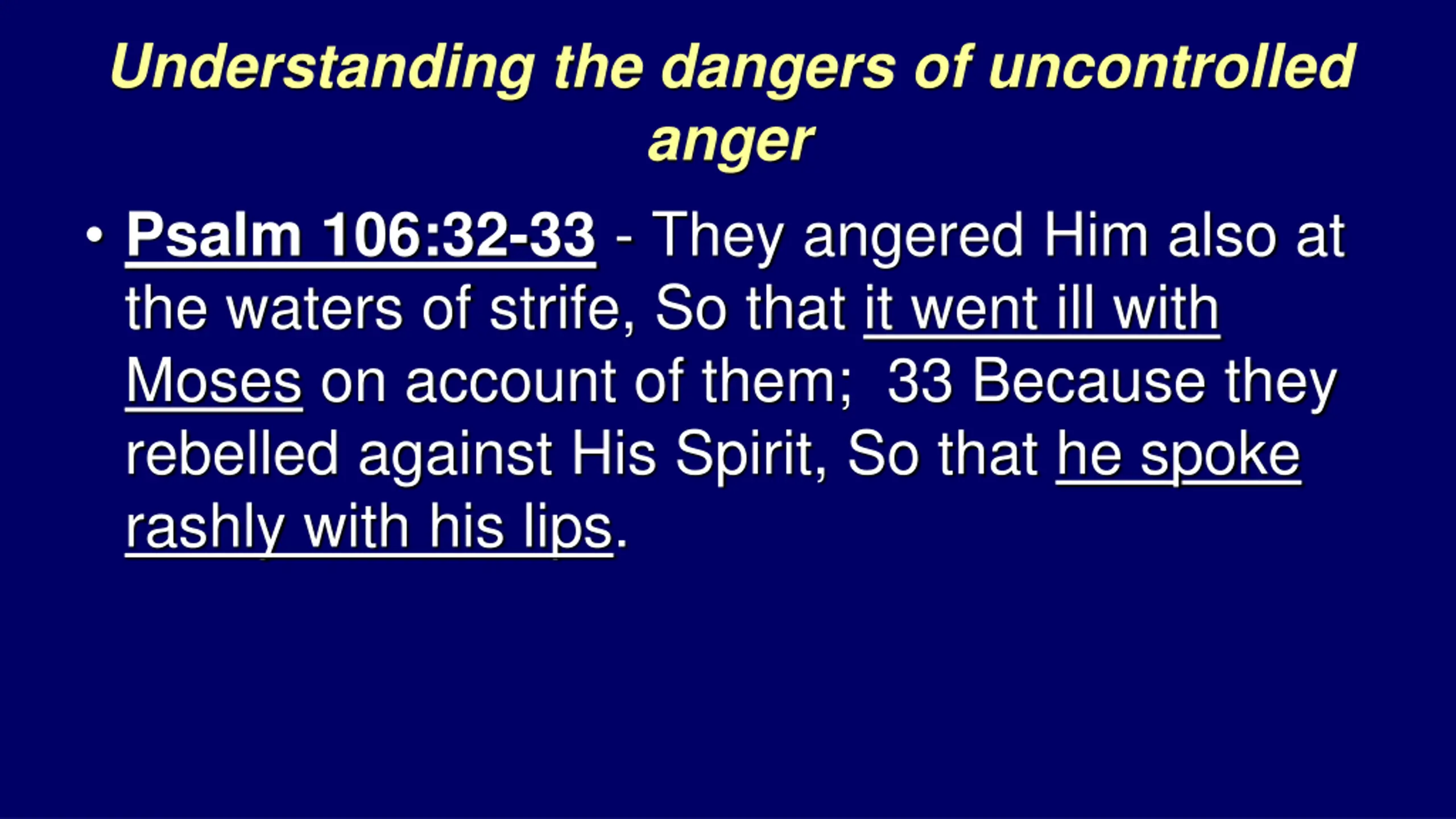 Understanding the dangers of uncontrolled anger Psalm 106:32-33 - They angered Him also at the waters of strife, So that it went ill with Moses on account of them; 33 Because they rebelled against His Spirit, So that he spoke rashly with his lips.