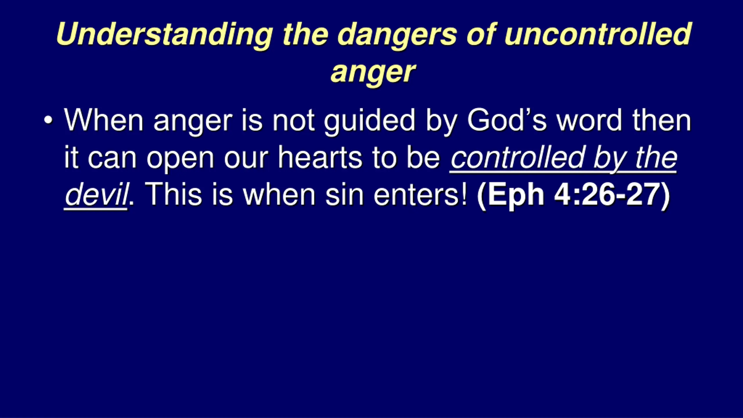 Understanding the dangers of uncontrolled anger When anger is not guided by God s word then it can open our hearts to be controlled by the devil. This is when sin enters! (Eph 4:26-27)