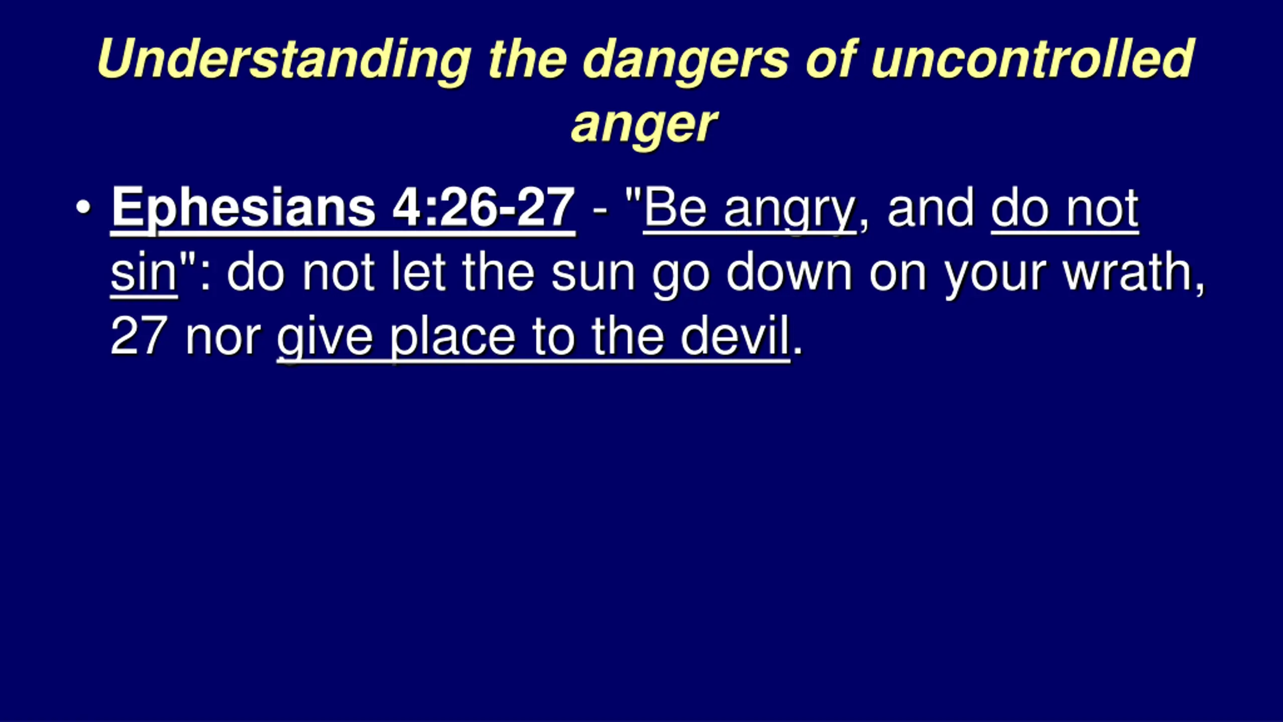 Understanding the dangers of uncontrolled anger Ephesians 4:26-27 - "Be angry, and do not sin": do not let the sun go down on your wrath, 27 nor give place to the devil.