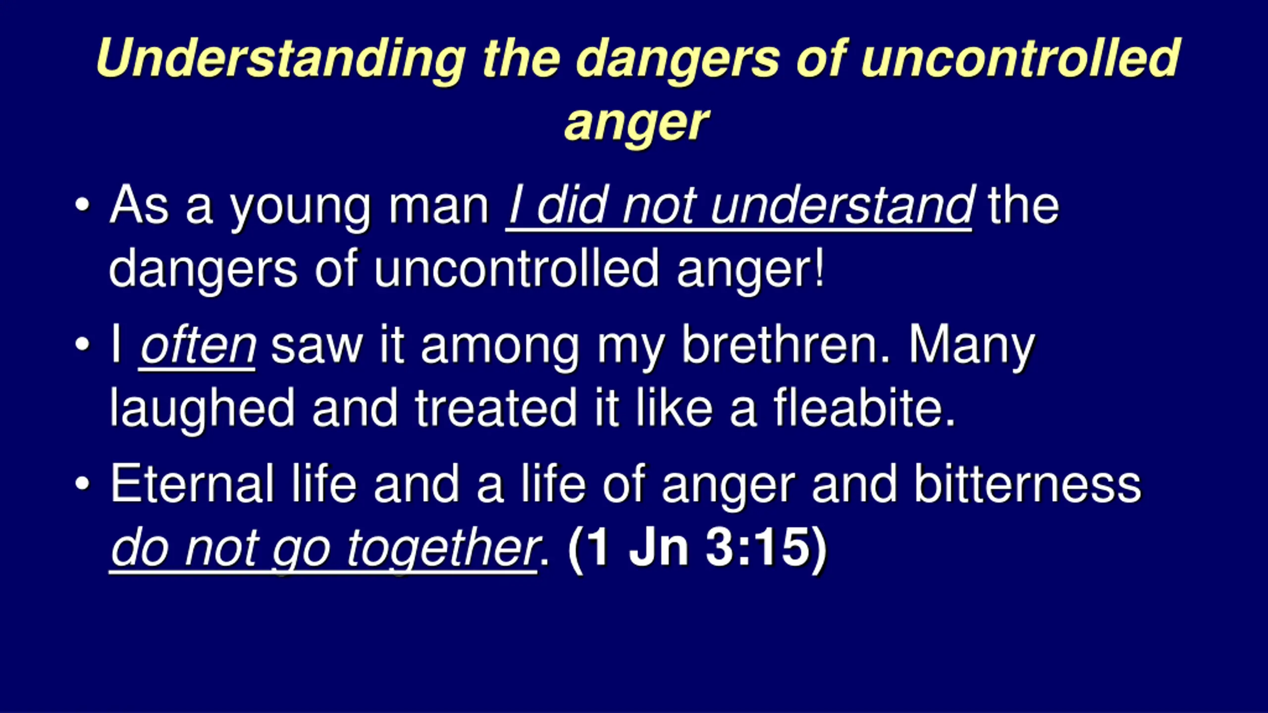 Understanding the dangers of uncontrolled anger As a young man I did not understand the dangers of uncontrolled anger! I often saw it among my brethren. Many laughed and treated it like a fleabite. Eternal life and a life of anger and bitterness do not go together. (1 Jn 3:15)