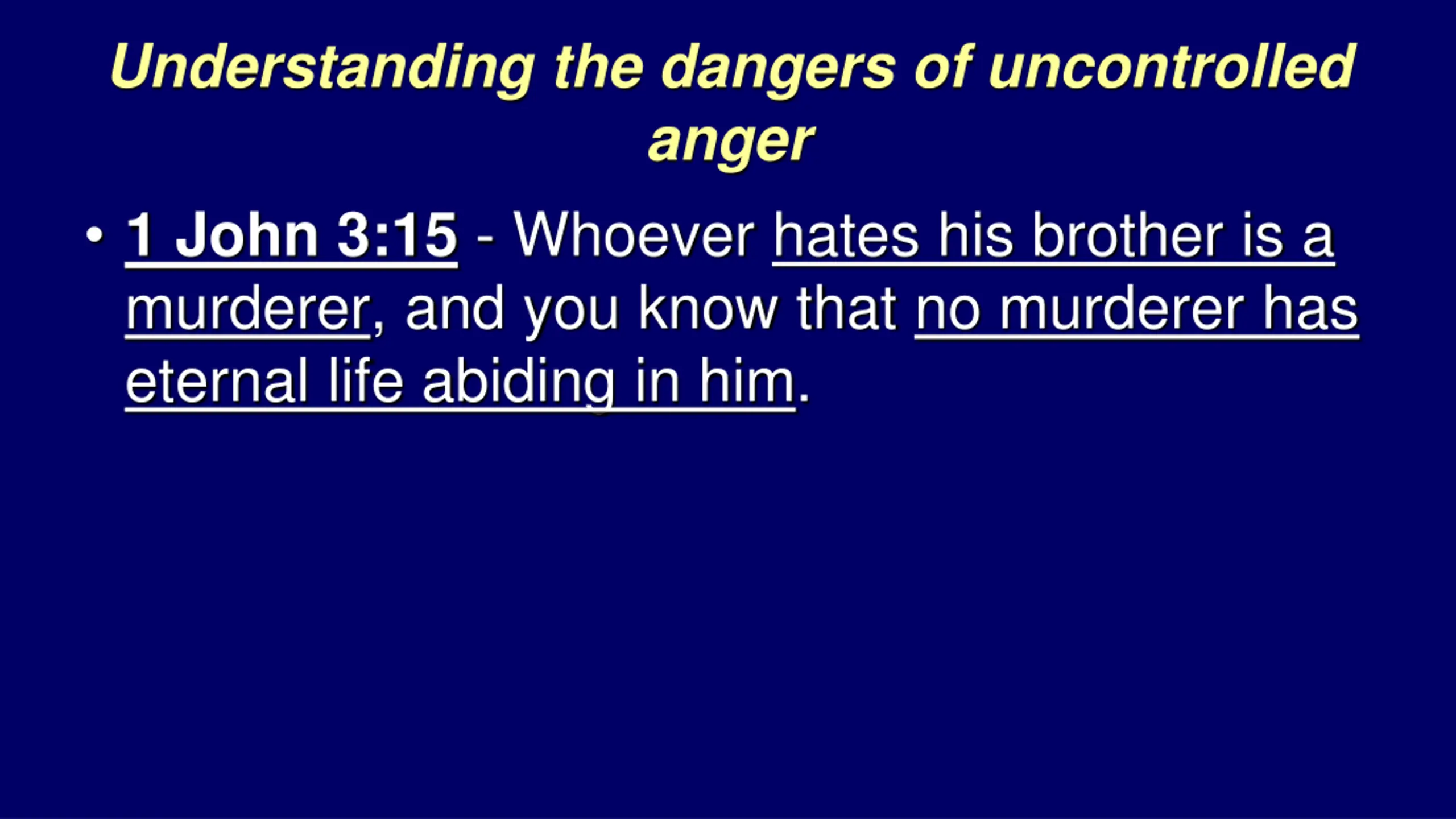 Understanding the dangers of uncontrolled anger 1 John 3:15 - Whoever hates his brother is a murderer, and you know that no murderer has eternal life abiding in him.