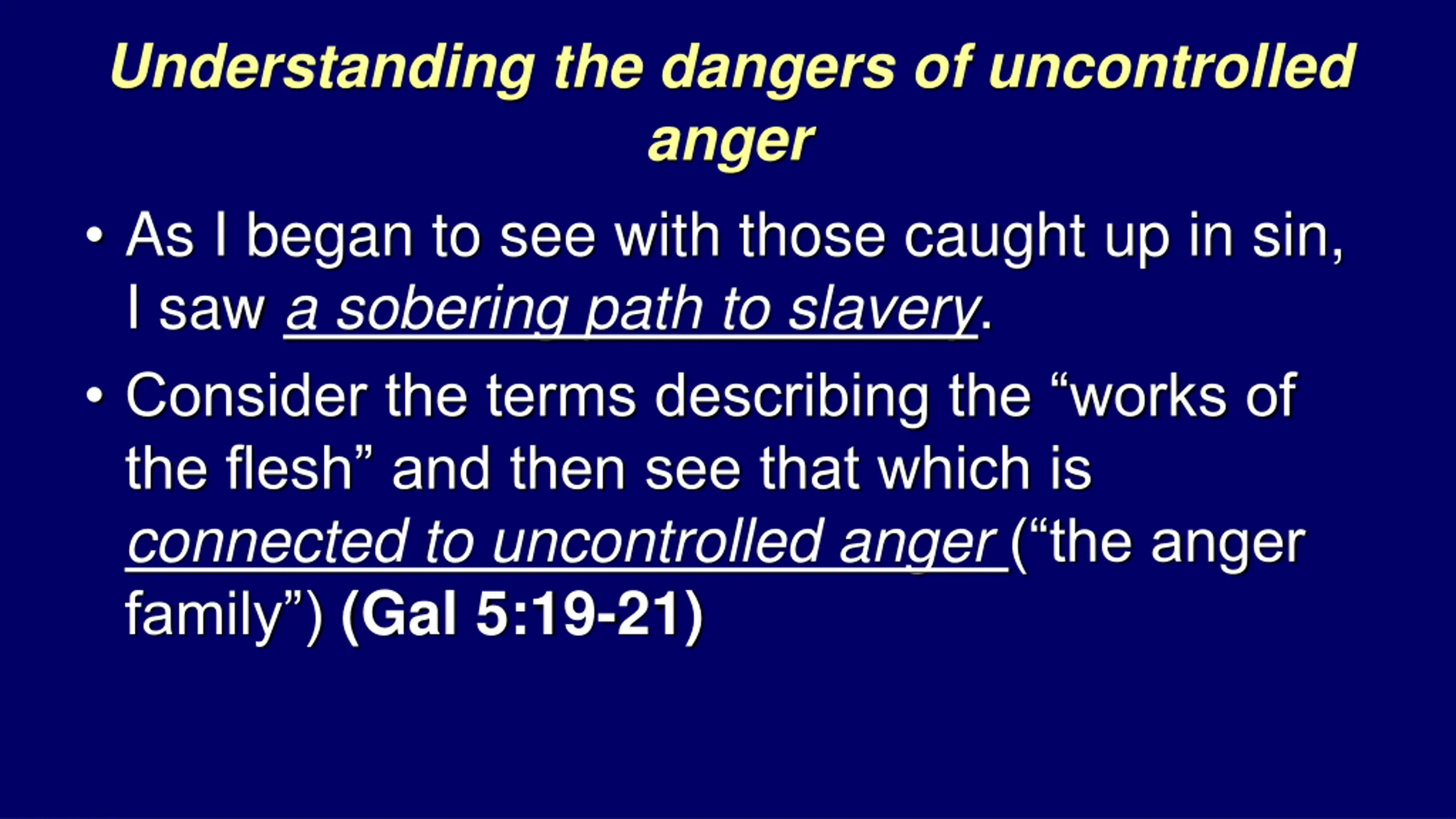 Understanding the dangers of uncontrolled anger As I began to see with those caught up in sin, I saw a sobering path to slavery. Consider the terms describing the works of the flesh and then see that which is connected to uncontrolled anger ( the anger family ) (Gal 5:19-21)