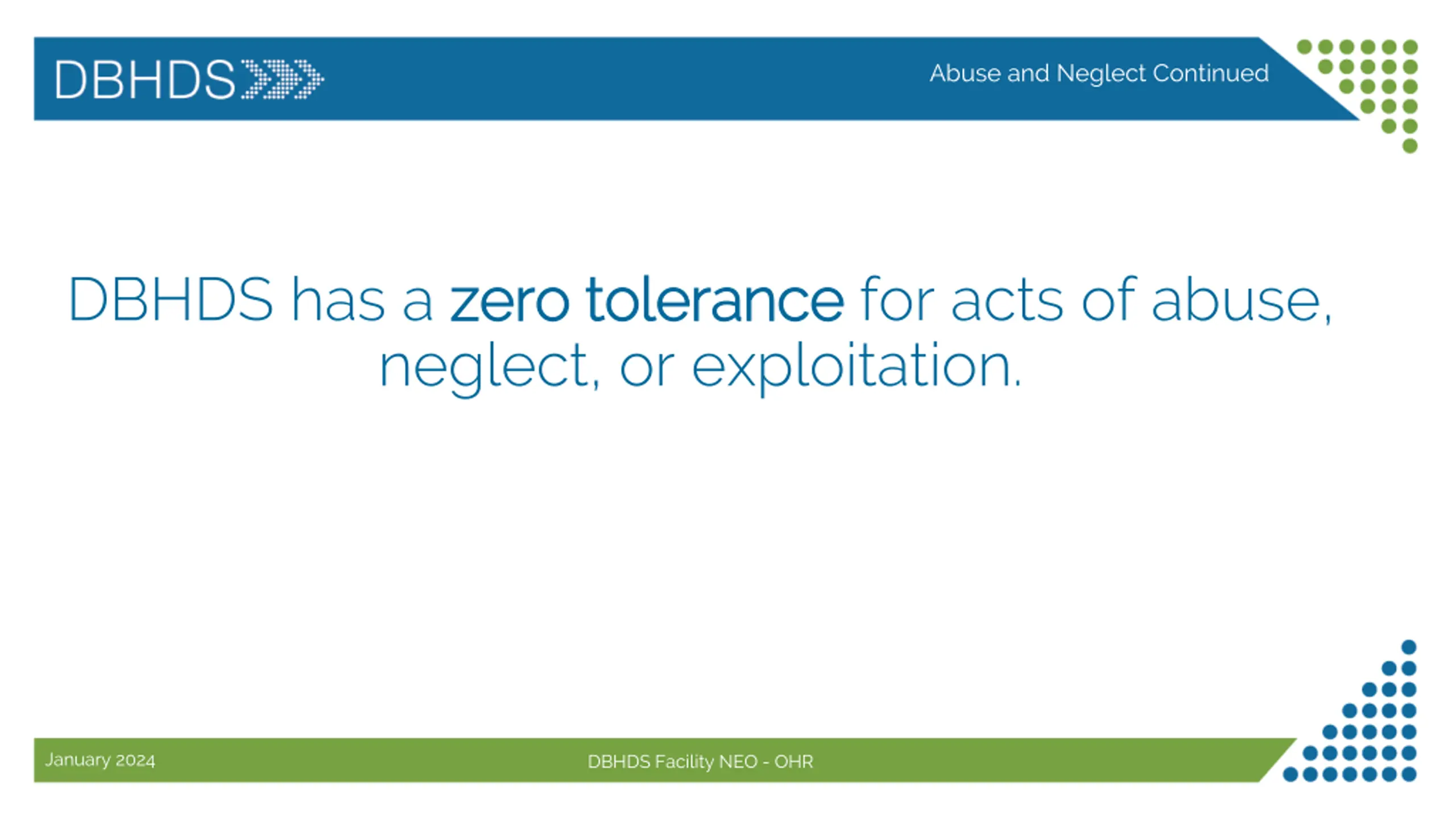 Abuse and Neglect Continued DBHDS has a zero tolerance zero tolerance for acts of abuse, neglect, or exploitation. January 2024 DBHDS Facility NEO - OHR