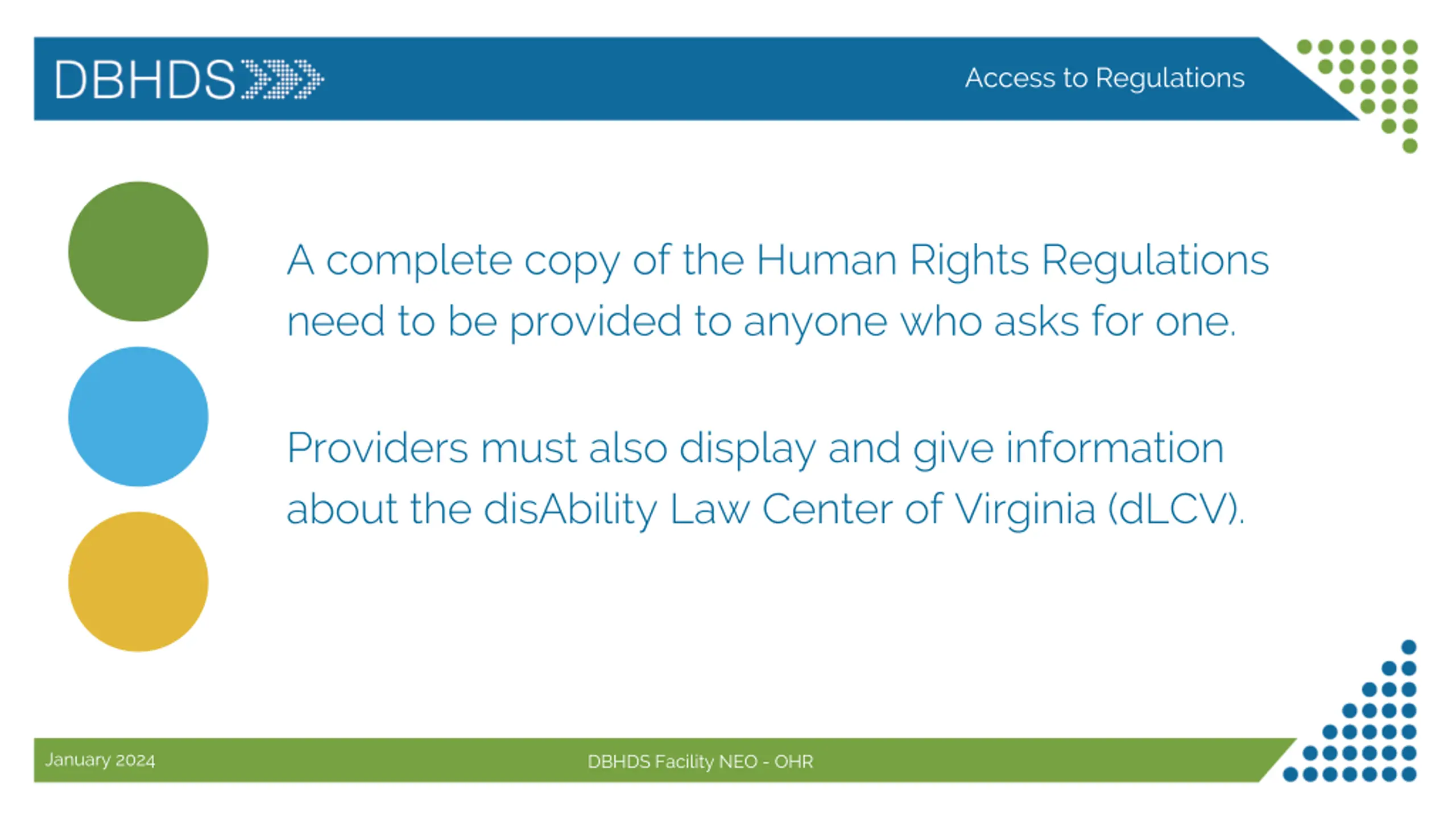 Access to Regulations A complete copy of the Human Rights Regulations need to be provided to anyone who asks for one. Providers must also display and give information about the disAbility Law Center of Virginia (dLCV). January 2024 DBHDS Facility NEO - OHR
