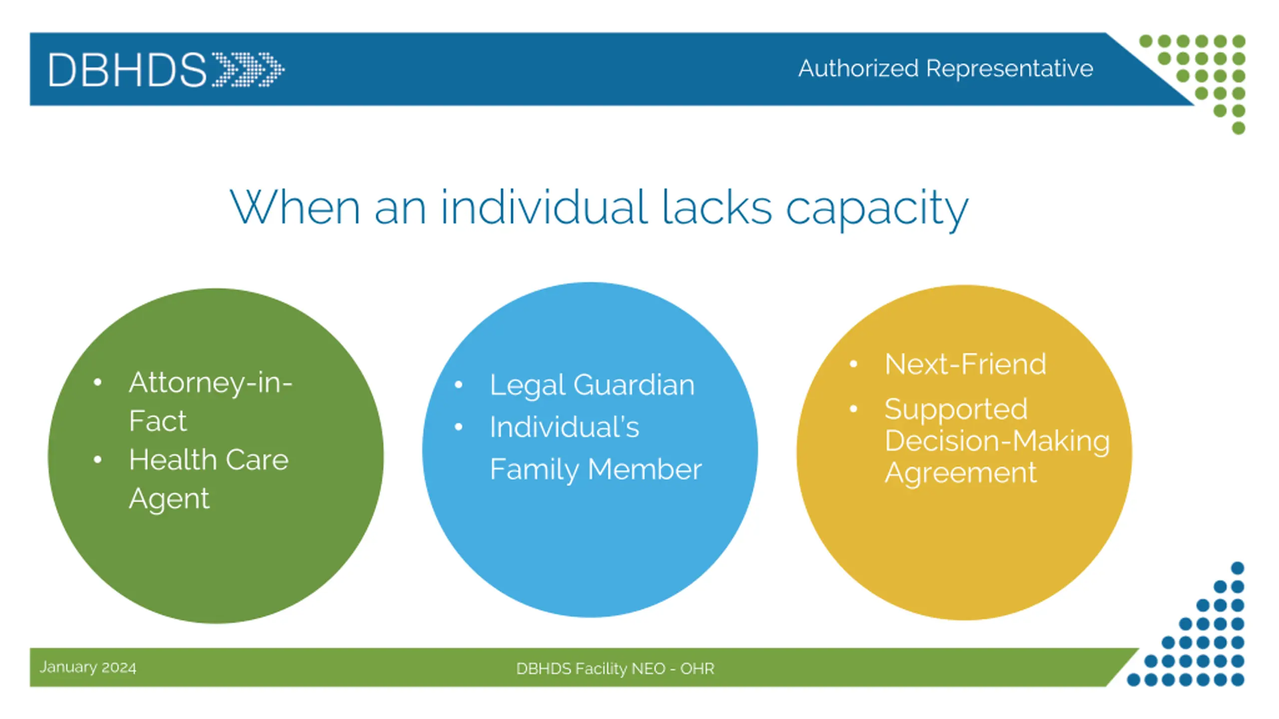 Authorized Representative When an individual lacks capacity Next-Friend Supported Decision-Making Agreement Attorney-in- Fact Health Care Agent Legal Guardian Individual s Family Member January 2024 DBHDS Facility NEO - OHR