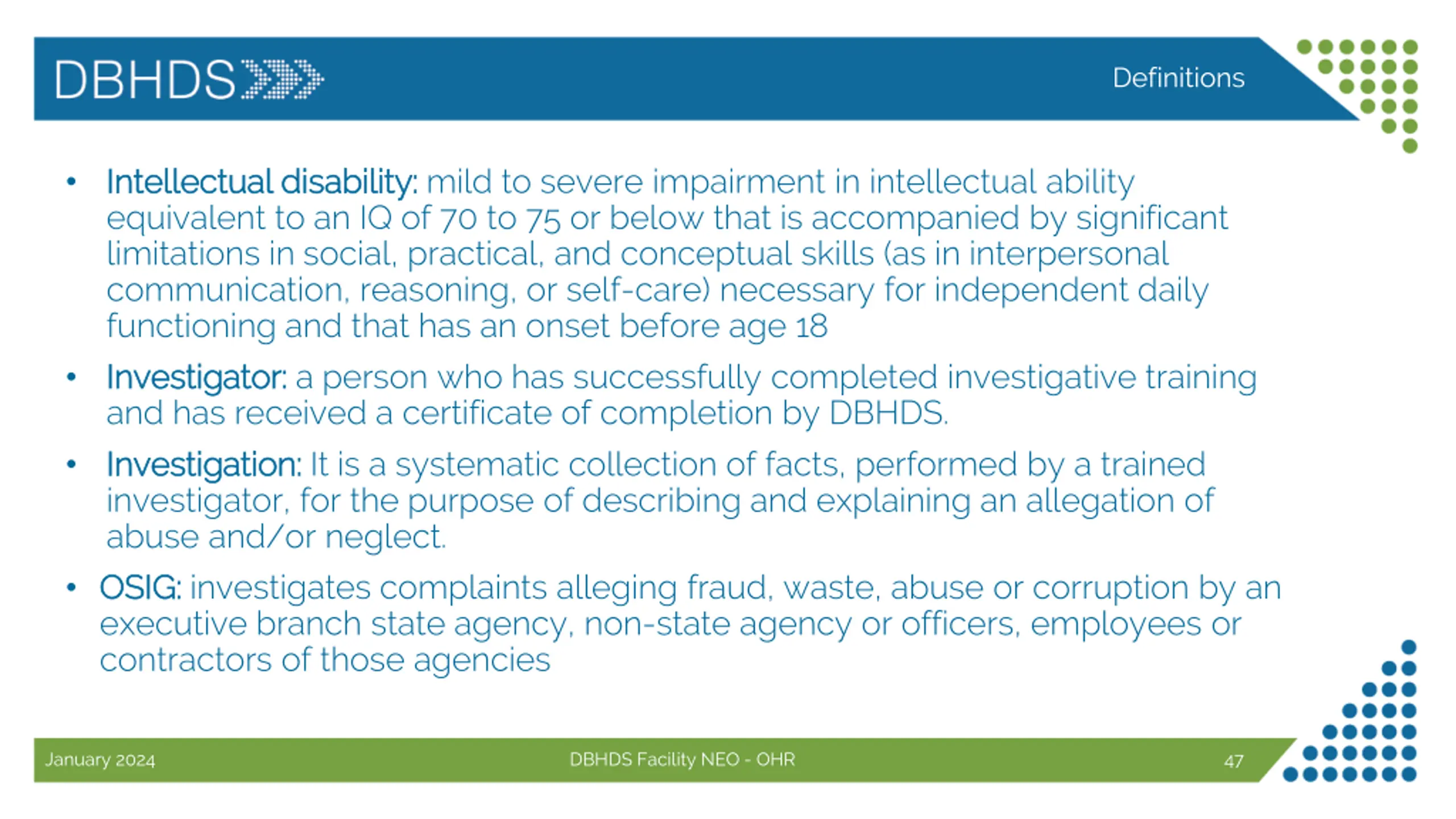 Definitions Intellectual disability: Intellectual disability: mild to severe impairment in intellectual ability equivalent to an IQ of 70 to 75 or below that is accompanied by significant limitations in social, practical, and conceptual skills (as in interpersonal communication, reasoning, or self-care) necessary for independent daily functioning and that has an onset before age 18 Investigator: Investigator: a person who has successfully completed investigative training and has received a certificate of completion by DBHDS. Investigation: Investigation: It is a systematic collection of facts, performed by a trained investigator, for the purpose of describing and explaining an allegation of abuse and/or neglect. OSIG: OSIG: investigates complaints alleging fraud, waste, abuse or corruption by an executive branch state agency, non-state agency or officers, employees or contractors of those agencies January 2024 DBHDS Facility NEO - OHR 47
