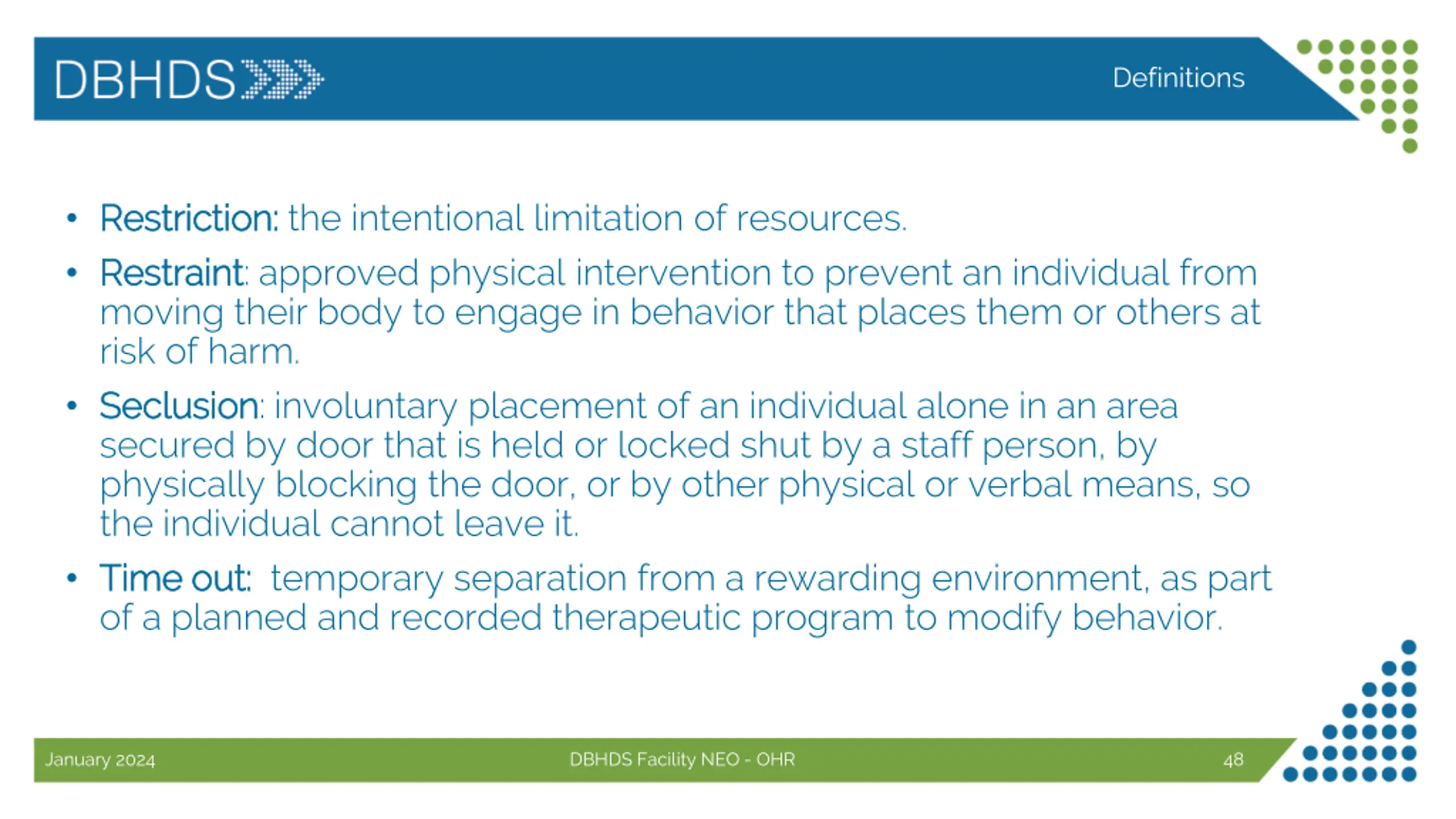 Definitions Restriction: Restriction: the intentional limitation of resources. Restraint Restraint: approved physical intervention to prevent an individual from moving their body to engage in behavior that places them or others at risk of harm. Seclusion Seclusion: involuntary placement of an individual alone in an area secured by door that is held or locked shut by a staff person, by physically blocking the door, or by other physical or verbal means, so the individual cannot leave it. Time out: Time out: temporary separation from a rewarding environment, as part of a planned and recorded therapeutic program to modify behavior. January 2024 DBHDS Facility NEO - OHR 48
