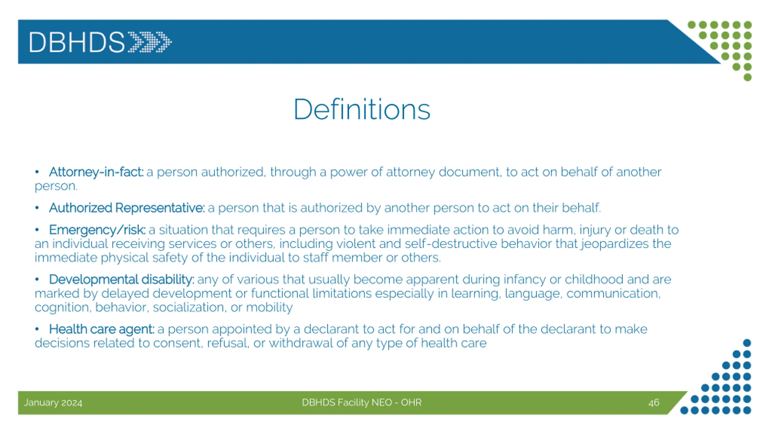 Definitions Attorney Attorney- -in in- -fact: person. fact: a person authorized, through a power of attorney document, to act on behalf of another Authorized Representative: Authorized Representative: a person that is authorized by another person to act on their behalf. Emergency/risk: Emergency/risk: a situation that requires a person to take immediate action to avoid harm, injury or death to an individual receiving services or others, including violent and self-destructive behavior that jeopardizes the immediate physical safety of the individual to staff member or others. Developmental disability: Developmental disability: any of various that usually become apparent during infancy or childhood and are marked by delayed development or functional limitations especially in learning, language, communication, cognition, behavior, socialization, or mobility Health care agent: Health care agent: a person appointed by a declarant to act for and on behalf of the declarant to make decisions related to consent, refusal, or withdrawal of any type of health care January 2024 DBHDS Facility NEO - OHR 46