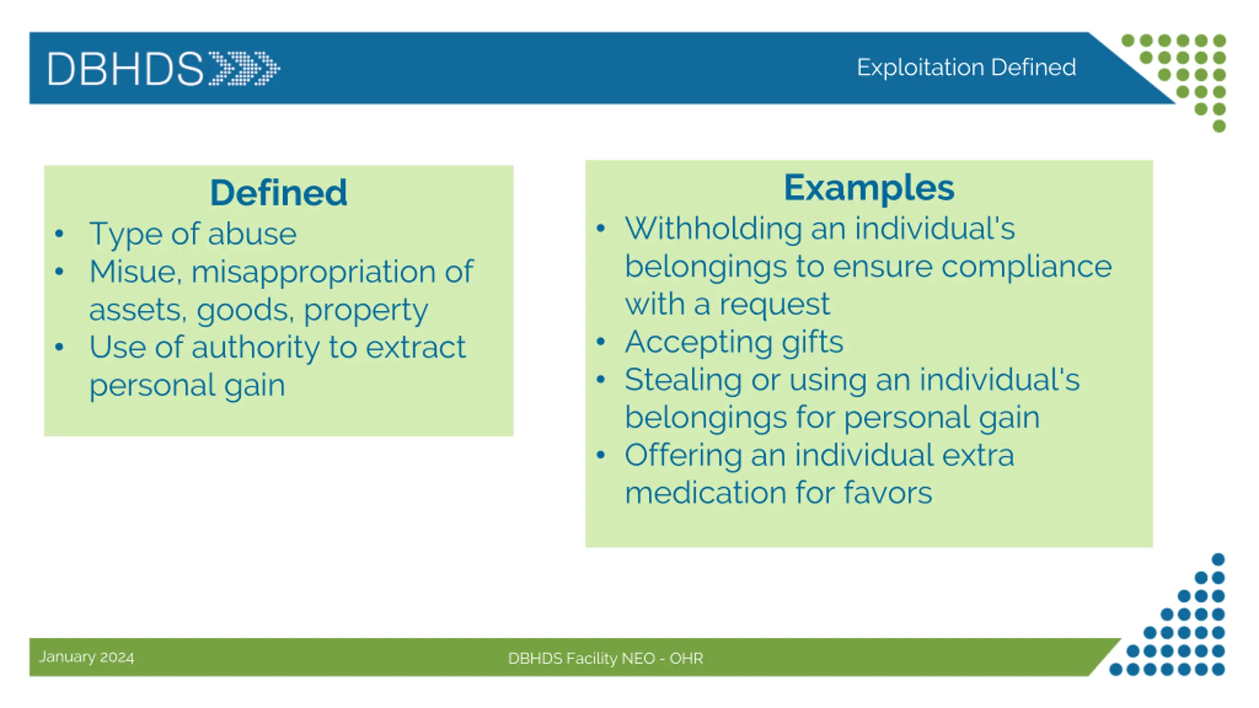 Exploitation Defined Examples Defined Withholding an individual's belongings to ensure compliance with a request Accepting gifts Stealing or using an individual's belongings for personal gain Offering an individual extra medication for favors Type of abuse Misue, misappropriation of assets, goods, property Use of authority to extract personal gain January 2024 DBHDS Facility NEO - OHR