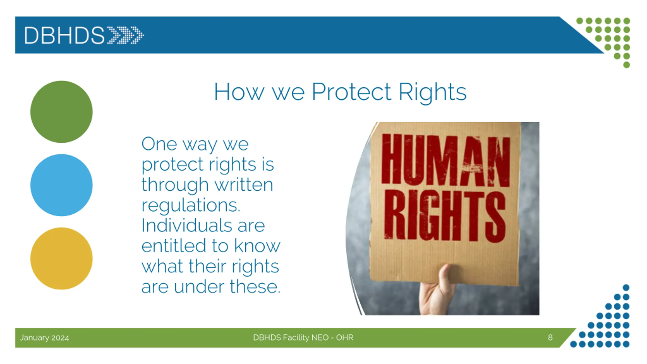 How we Protect Rights One way we protect rights is through written regulations. Individuals are entitled to know what their rights are under these. January 2024 DBHDS Facility NEO - OHR 8