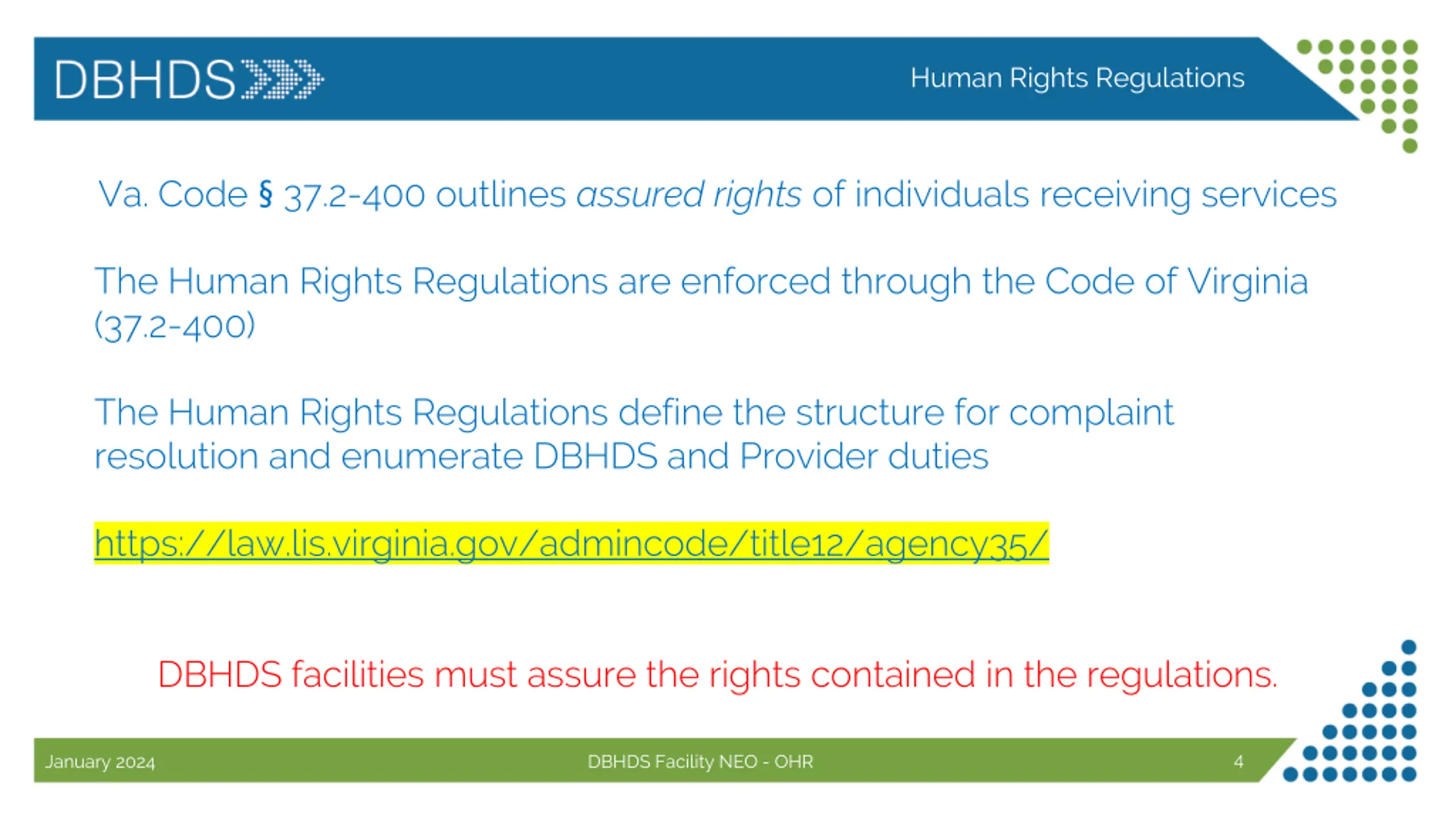 Human Rights Regulations Va. Code 37.2-400 outlines assured rights of individuals receiving services The Human Rights Regulations are enforced through the Code of Virginia (37.2-400) The Human Rights Regulations define the structure for complaint resolution and enumerate DBHDS and Provider duties https://law.lis.virginia.gov/admincode/title12/agency35/ DBHDS facilities must assure the rights contained in the regulations. 4 January 2024 DBHDS Facility NEO - OHR