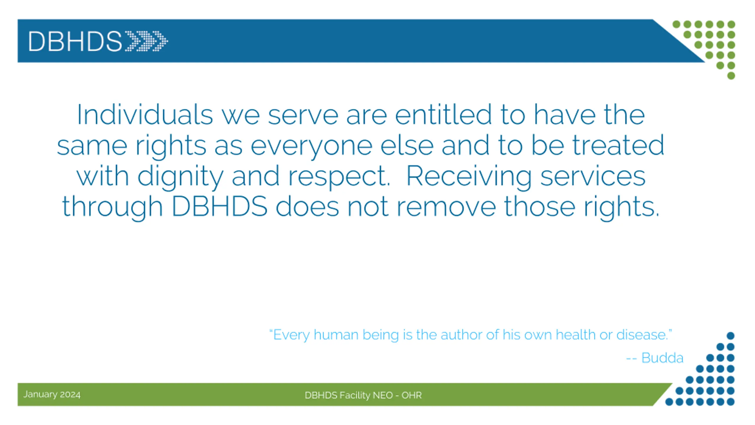 Individuals we serve are entitled to have the same rights as everyone else and to be treated with dignity and respect. Receiving services through DBHDS does not remove those rights. Every human being is the author of his own health or disease. -- Budda January 2024 DBHDS Facility NEO - OHR