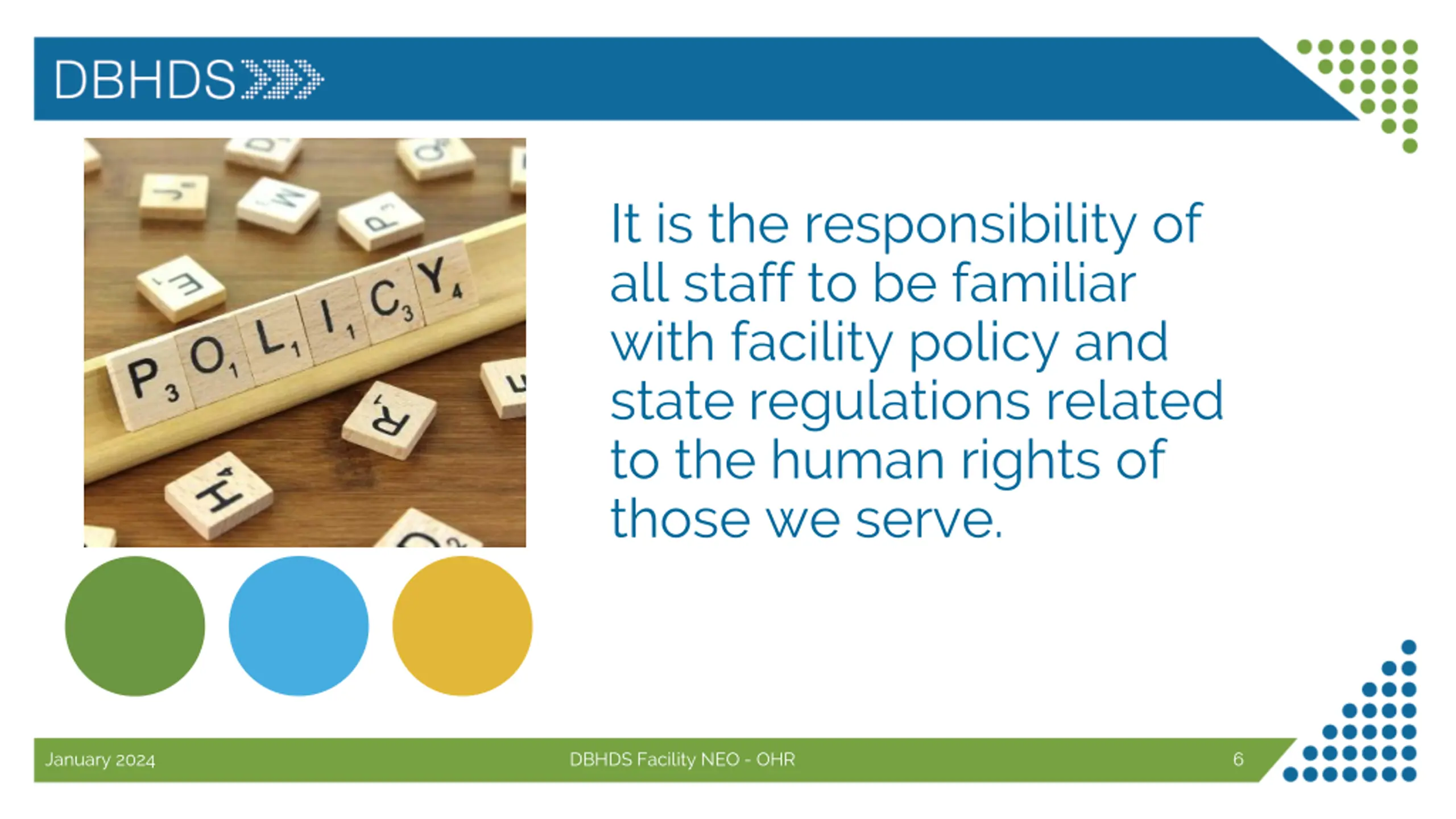 It is the responsibility of all staff to be familiar with facility policy and state regulations related to the human rights of those we serve. January 2024 DBHDS Facility NEO - OHR 6