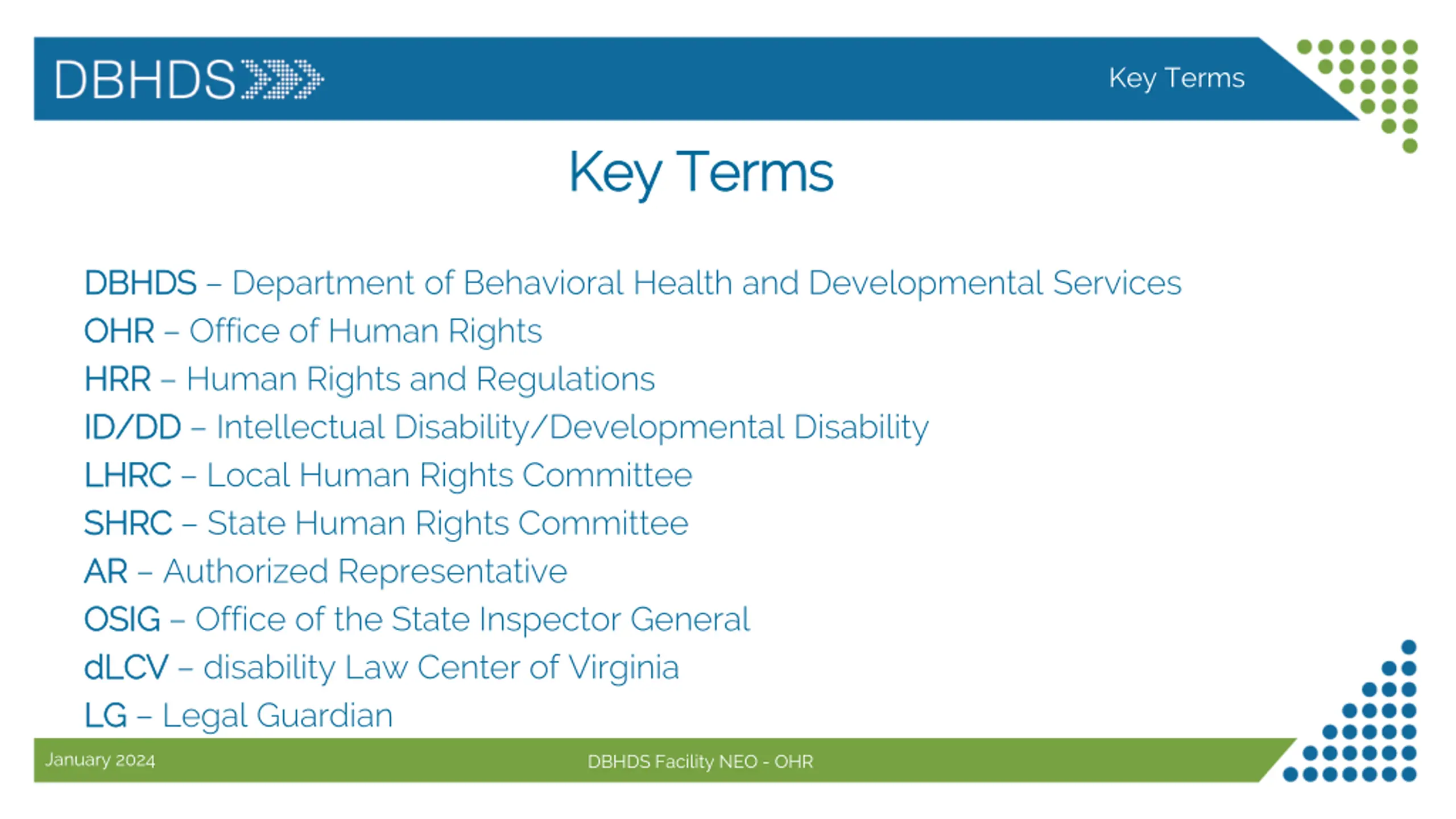 Key Terms Key Terms Key Terms DBHDS DBHDS Department of Behavioral Health and Developmental Services OHR OHR Office of Human Rights HRR HRR Human Rights and Regulations ID/DD ID/DD Intellectual Disability/Developmental Disability LHRC LHRC Local Human Rights Committee SHRC SHRC State Human Rights Committee AR AR Authorized Representative OSIG OSIG Office of the State Inspector General dLCV dLCV disability Law Center of Virginia LG LG Legal Guardian January 2024 DBHDS Facility NEO - OHR