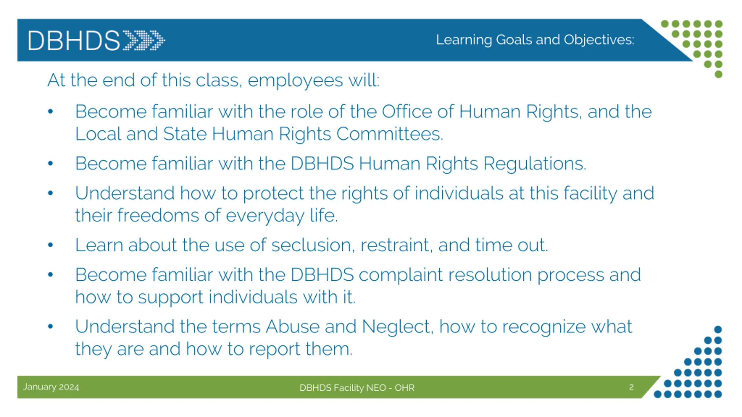 Learning Goals and Objectives: At the end of this class, employees will: Become familiar with the role of the Office of Human Rights, and the Local and State Human Rights Committees. Become familiar with the DBHDS Human Rights Regulations. Understand how to protect the rights of individuals at this facility and their freedoms of everyday life. Learn about the use of seclusion, restraint, and time out. Become familiar with the DBHDS complaint resolution process and how to support individuals with it. Understand the terms Abuse and Neglect, how to recognize what they are and how to report them. January 2024 2 DBHDS Facility NEO - OHR