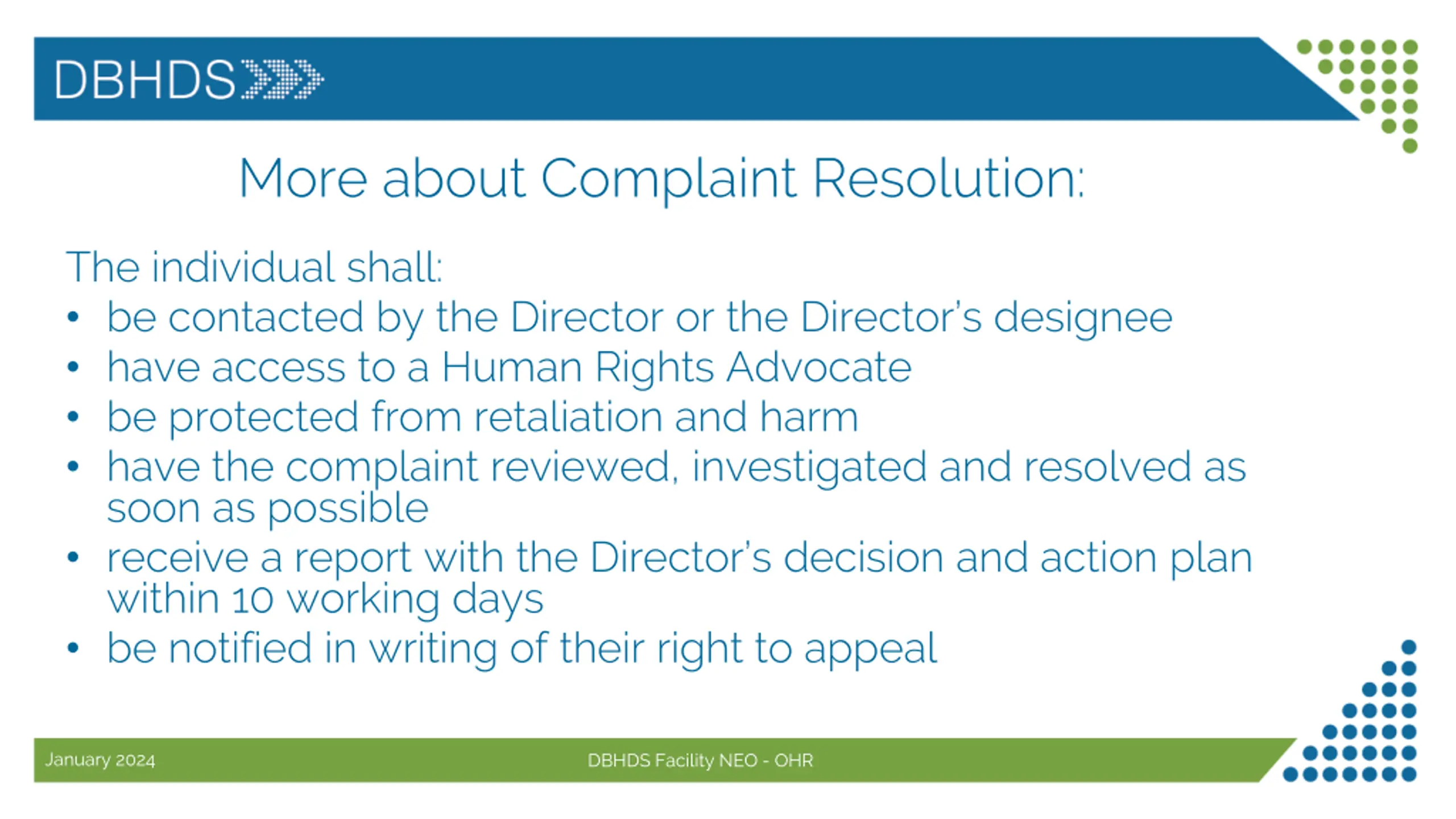 More about Complaint Resolution: The individual shall: be contacted by the Director or the Director s designee have access to a Human Rights Advocate be protected from retaliation and harm have the complaint reviewed, investigated and resolved as soon as possible receive a report with the Director s decision and action plan within 10 working days be notified in writing of their right to appeal January 2024 DBHDS Facility NEO - OHR
