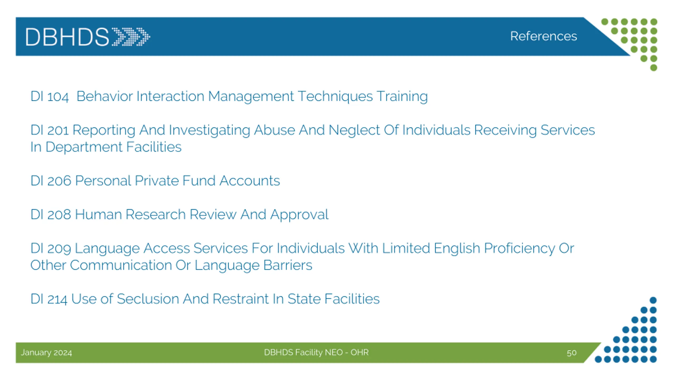 References DI 104 Behavior Interaction Management Techniques Training DI 201 Reporting And Investigating Abuse And Neglect Of Individuals Receiving Services In Department Facilities DI 206 Personal Private Fund Accounts DI 208 Human Research Review And Approval DI 209 Language Access Services For Individuals With Limited English Proficiency Or Other Communication Or Language Barriers DI 214 Use of Seclusion And Restraint In State Facilities January 2024 DBHDS Facility NEO - OHR 50