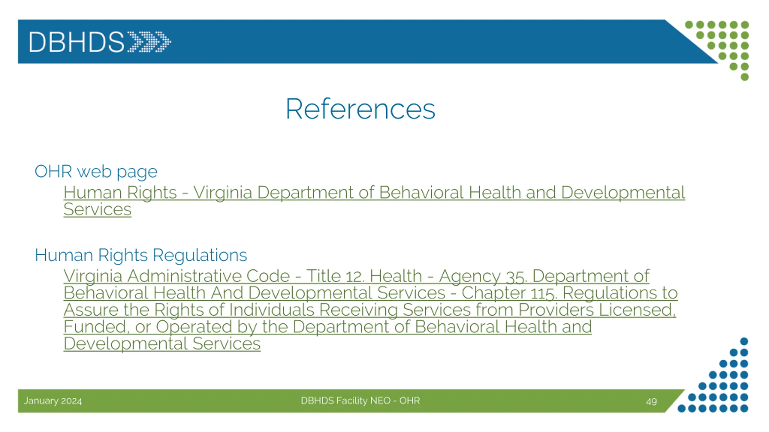 References OHR web page Human Rights - Virginia Department of Behavioral Health and Developmental Services Human Rights Regulations Virginia Administrative Code - Title 12. Health - Agency 35. Department of Behavioral Health And Developmental Services - Chapter 115. Regulations to Assure the Rights of Individuals Receiving Services from Providers Licensed, Funded, or Operated by the Department of Behavioral Health and Developmental Services January 2024 DBHDS Facility NEO - OHR 49