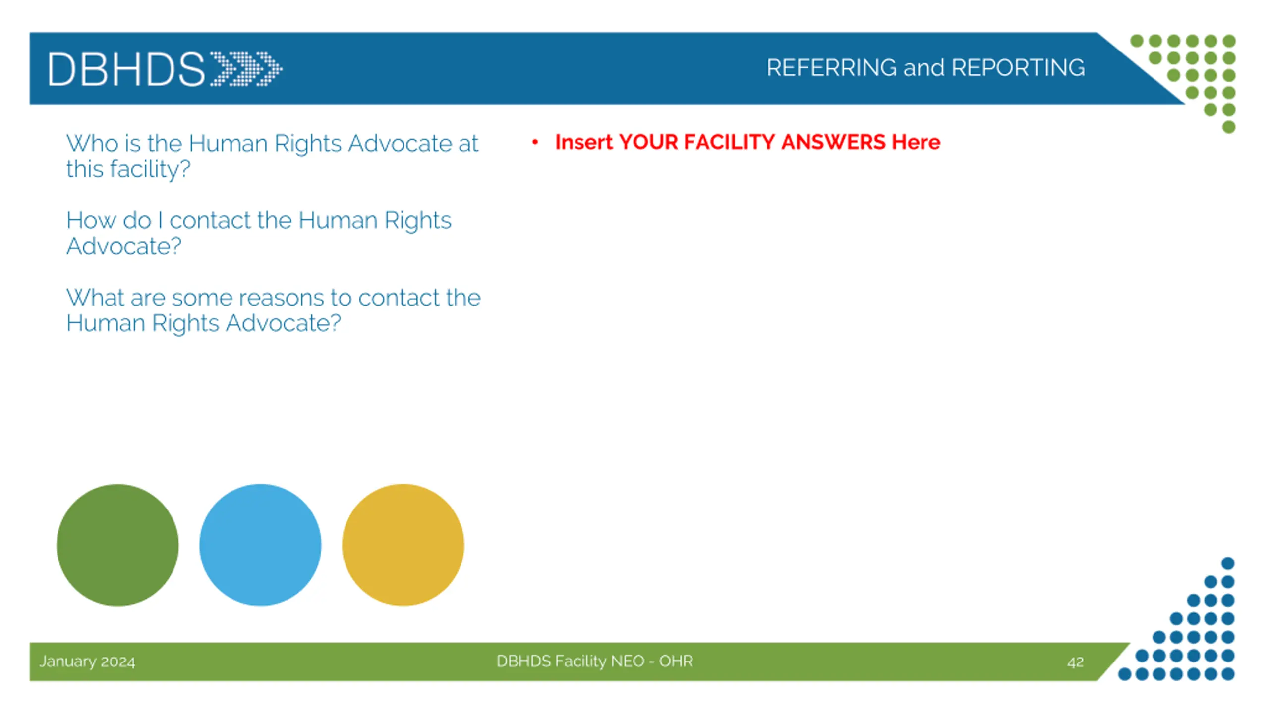 REFERRING and REPORTING Who is the Human Rights Advocate at this facility? Insert YOUR FACILITY ANSWERS Here How do I contact the Human Rights Advocate? What are some reasons to contact the Human Rights Advocate? January 2024 DBHDS Facility NEO - OHR 42