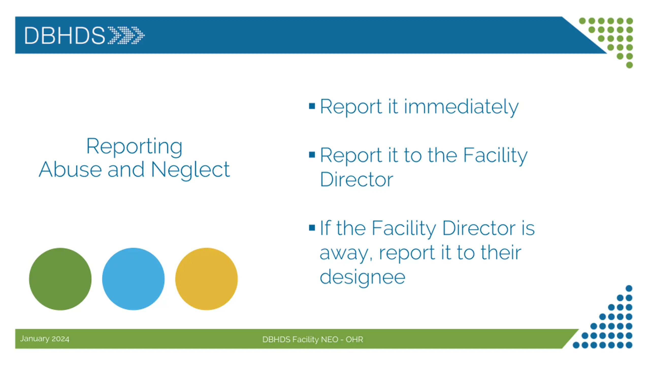 Report it immediately Reporting Abuse and Neglect Report it to the Facility Director If the Facility Director is away, report it to their designee January 2024 DBHDS Facility NEO - OHR
