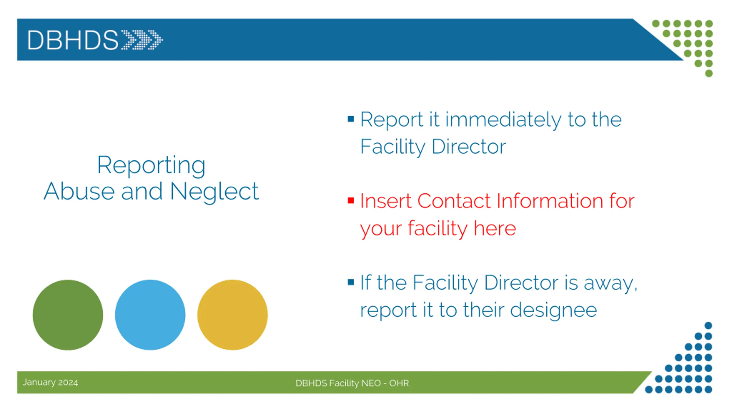 Report it immediately to the Facility Director Reporting Abuse and Neglect Insert Contact Information for your facility here If the Facility Director is away, report it to their designee January 2024 DBHDS Facility NEO - OHR