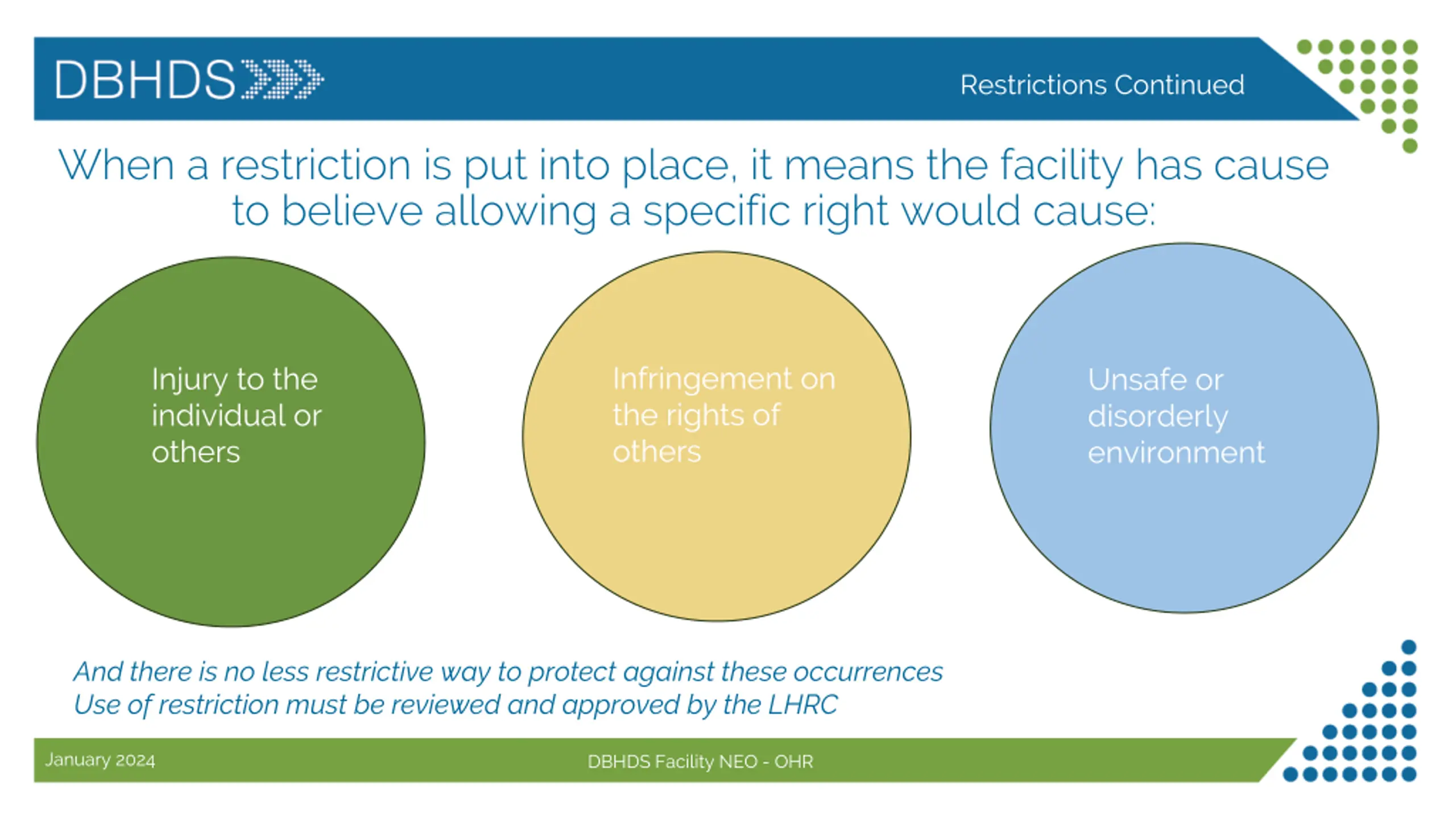 Restrictions Continued When a restriction is put into place, it means the facility has cause to believe allowing a specific right would cause: Infringement on the rights of others Injury to the individual or others Unsafe or disorderly environment And there is no less restrictive way to protect against these occurrences Use of restriction must be reviewed and approved by the LHRC January 2024 DBHDS Facility NEO - OHR