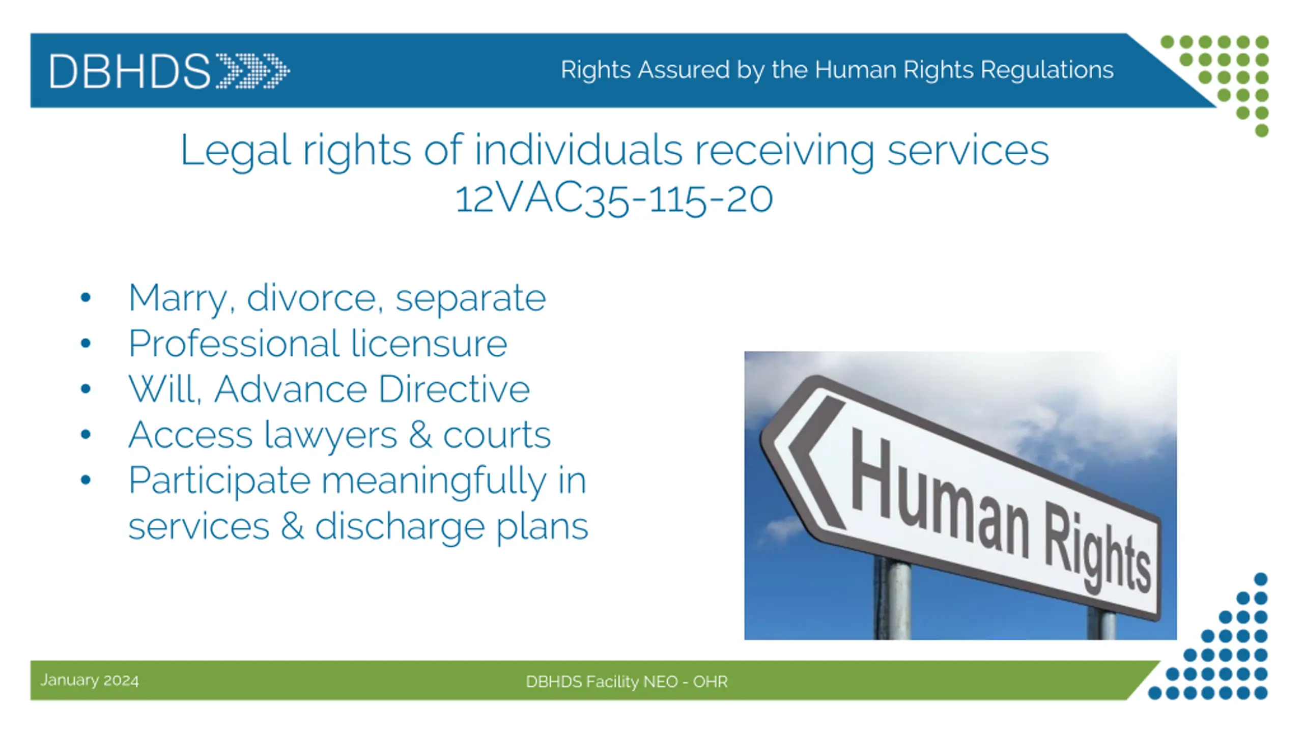 Rights Assured by the Human Rights Regulations Legal rights of individuals receiving services 12VAC35-115-20 Marry, divorce, separate Professional licensure Will, Advance Directive Access lawyers & courts Participate meaningfully in services & discharge plans January 2024 DBHDS Facility NEO - OHR