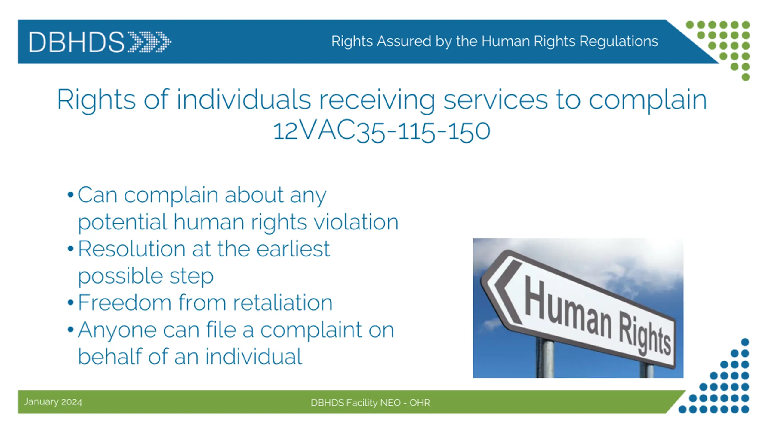 Rights Assured by the Human Rights Regulations Rights of individuals receiving services to complain 12VAC35-115-150 Can complain about any potential human rights violation Resolution at the earliest possible step Freedom from retaliation Anyone can file a complaint on behalf of an individual January 2024 DBHDS Facility NEO - OHR