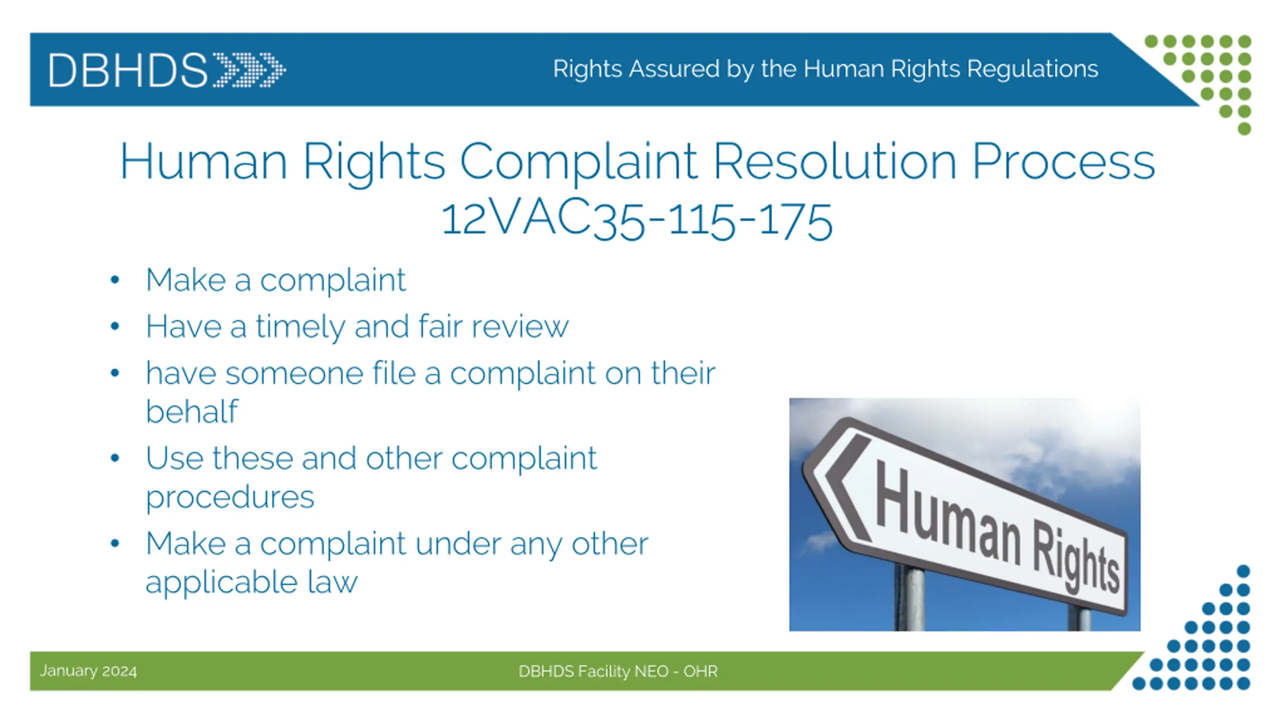 Rights Assured by the Human Rights Regulations Human Rights Complaint Resolution Process 12VAC35-115-175 Make a complaint Have a timely and fair review have someone file a complaint on their behalf Use these and other complaint procedures Make a complaint under any other applicable law January 2024 DBHDS Facility NEO - OHR