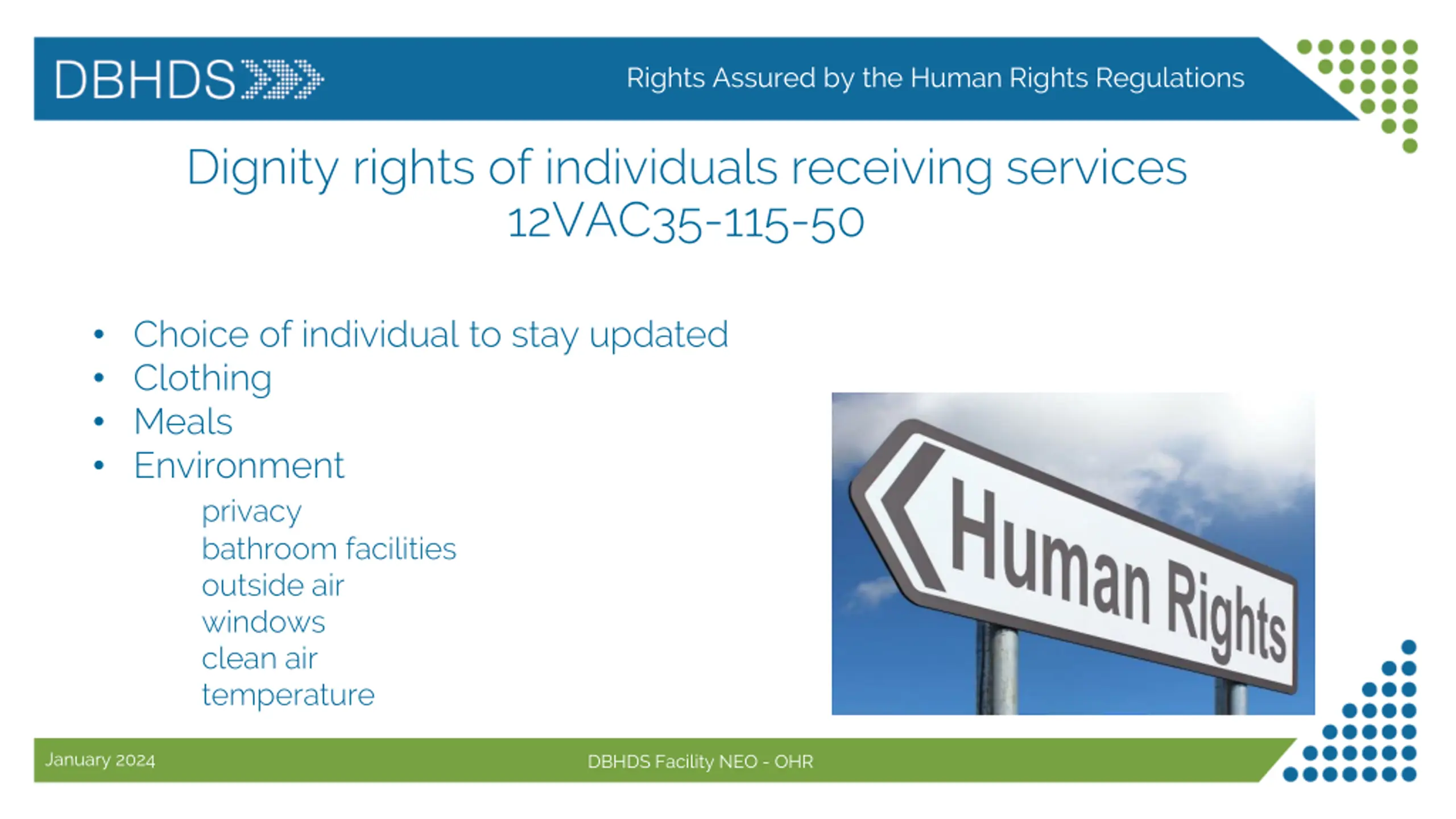 Rights Assured by the Human Rights Regulations Dignity rights of individuals receiving services 12VAC35-115-50 Choice of individual to stay updated Clothing Meals Environment privacy bathroom facilities outside air windows clean air temperature January 2024 DBHDS Facility NEO - OHR