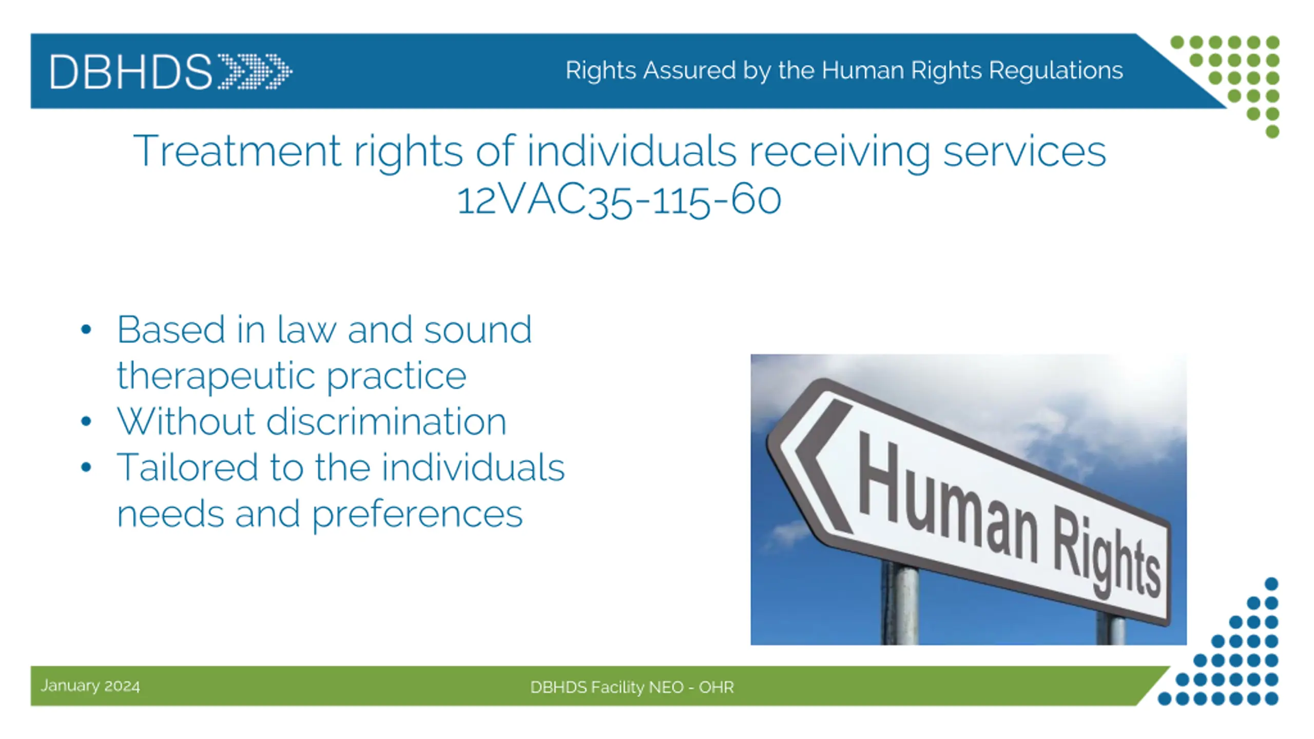 Rights Assured by the Human Rights Regulations Treatment rights of individuals receiving services 12VAC35-115-60 Based in law and sound therapeutic practice Without discrimination Tailored to the individuals needs and preferences January 2024 DBHDS Facility NEO - OHR