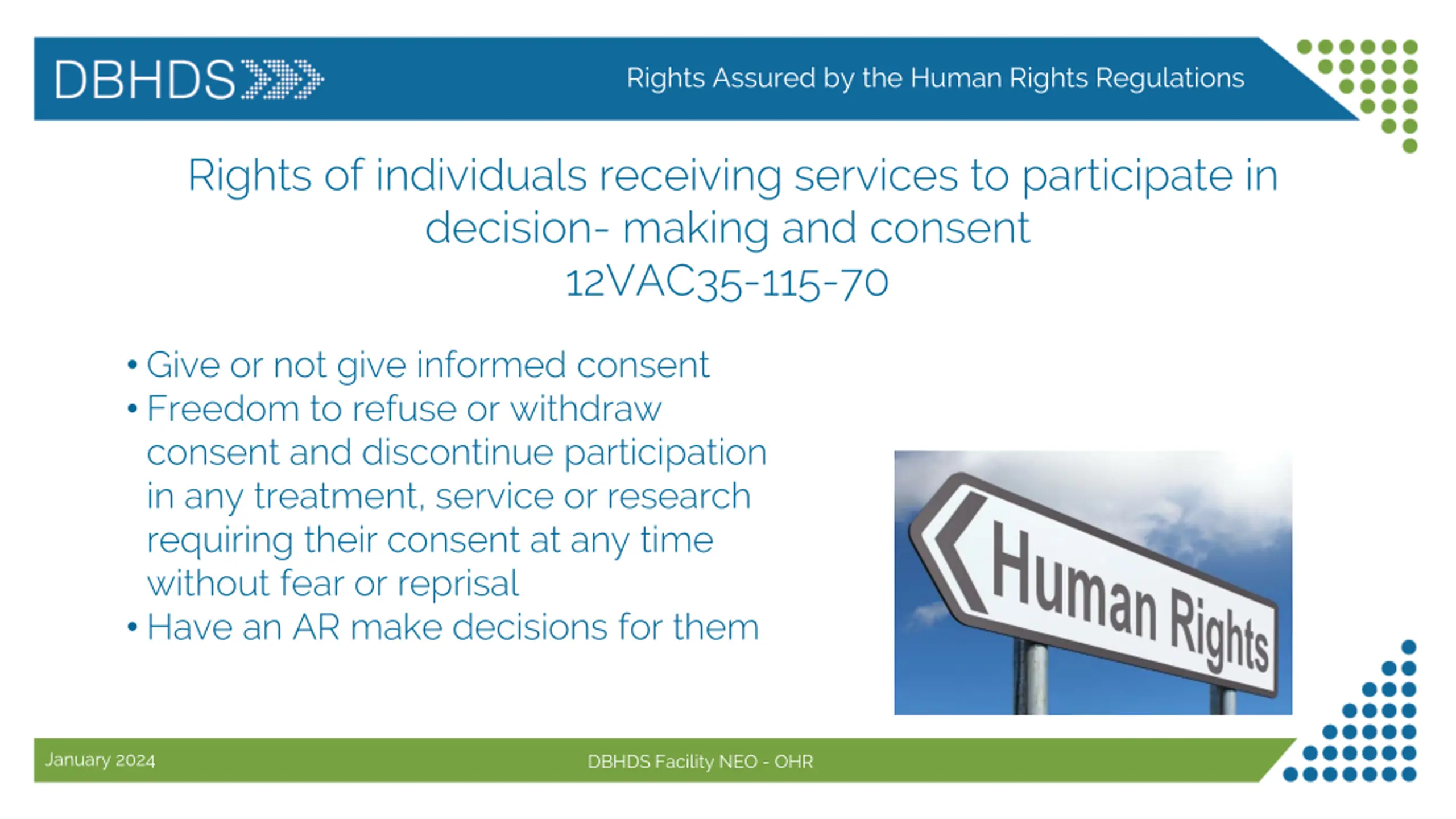 Rights Assured by the Human Rights Regulations Rights of individuals receiving services to participate in decision- making and consent 12VAC35-115-70 Give or not give informed consent Freedom to refuse or withdraw consent and discontinue participation in any treatment, service or research requiring their consent at any time without fear or reprisal Have an AR make decisions for them January 2024 DBHDS Facility NEO - OHR