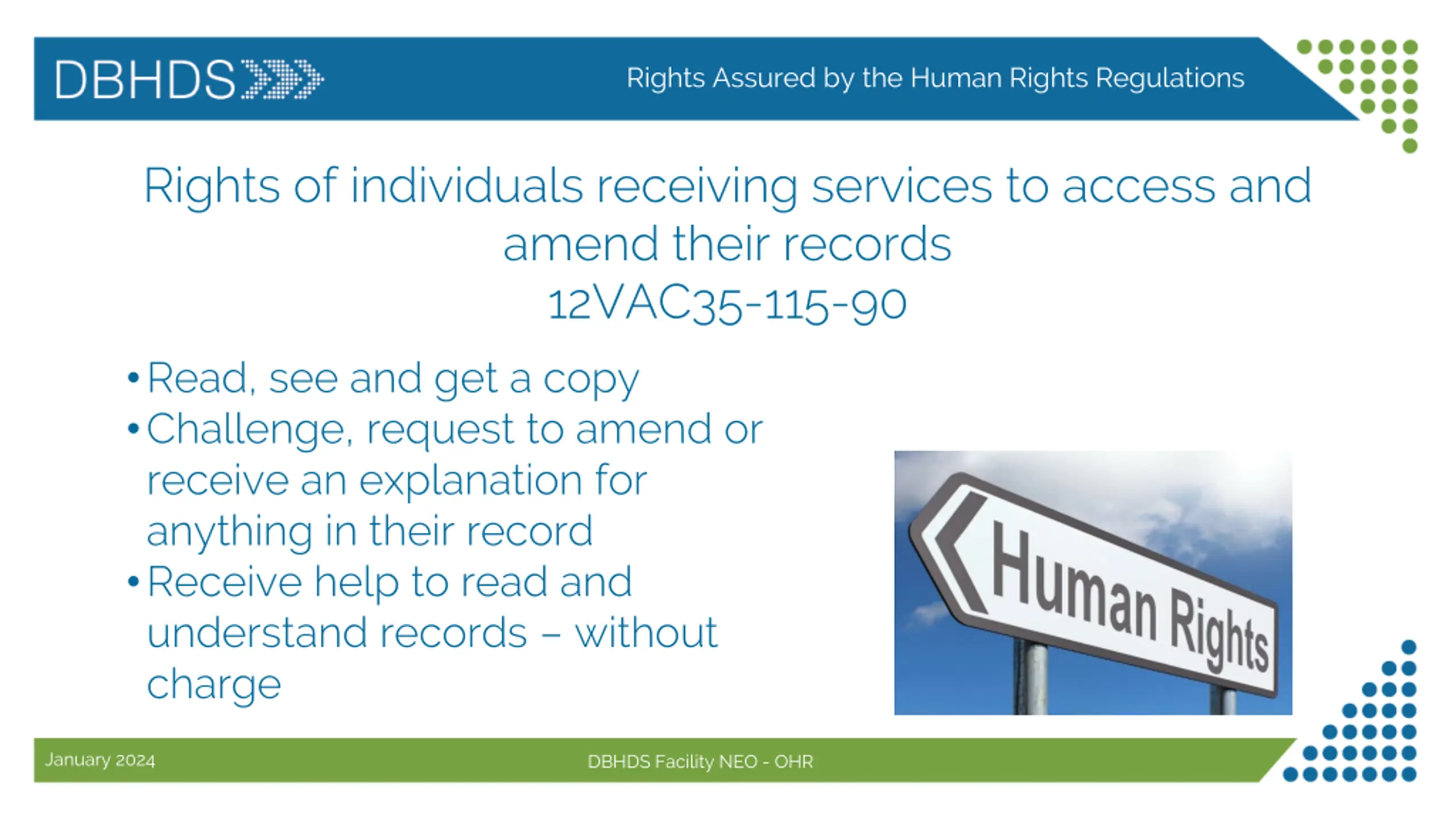Rights Assured by the Human Rights Regulations Rights of individuals receiving services to access and amend their records 12VAC35-115-90 Read, see and get a copy Challenge, request to amend or receive an explanation for anything in their record Receive help to read and understand records without charge January 2024 DBHDS Facility NEO - OHR