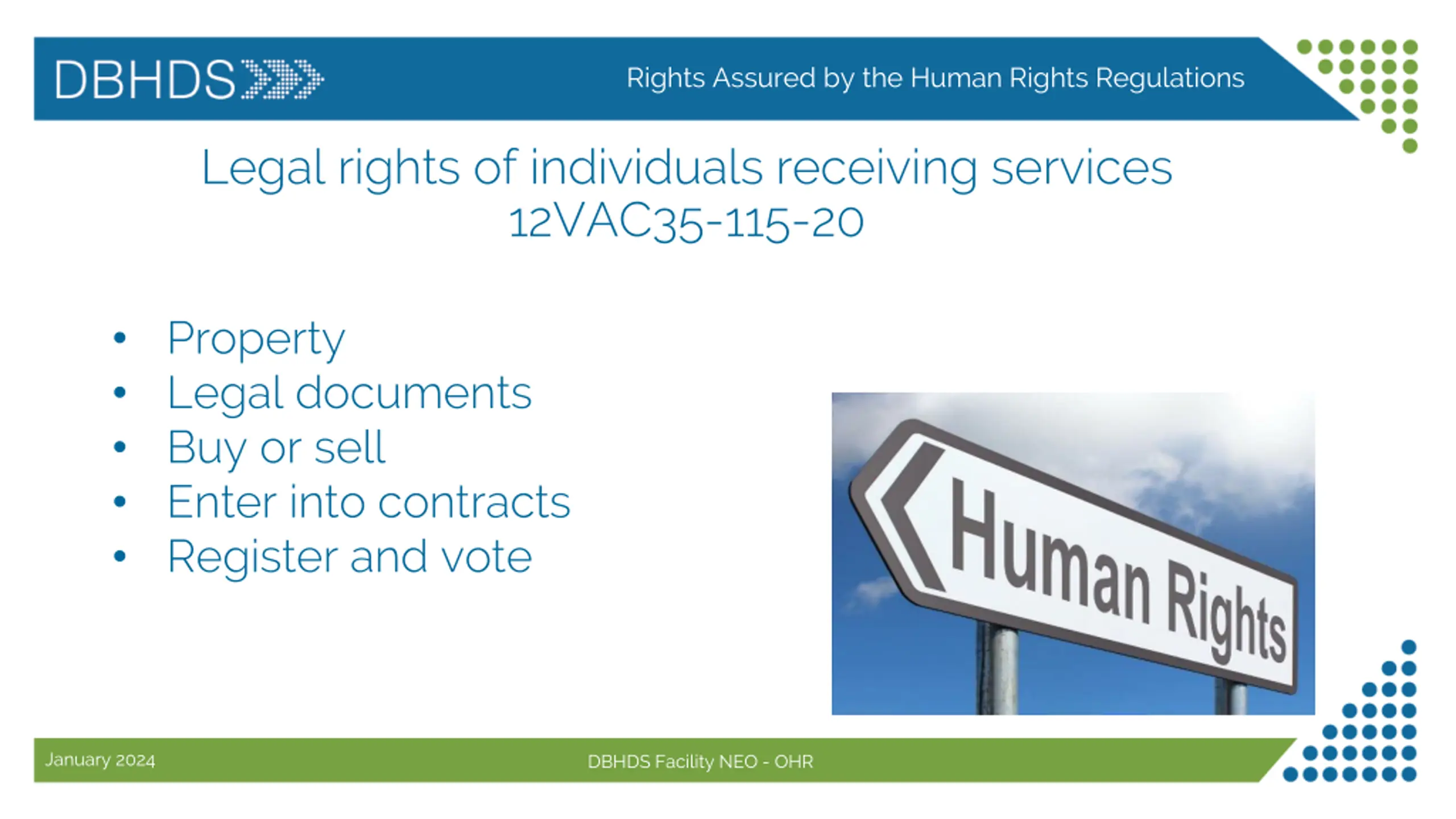 Rights Assured by the Human Rights Regulations Legal rights of individuals receiving services 12VAC35-115-20 Property Legal documents Buy or sell Enter into contracts Register and vote January 2024 DBHDS Facility NEO - OHR