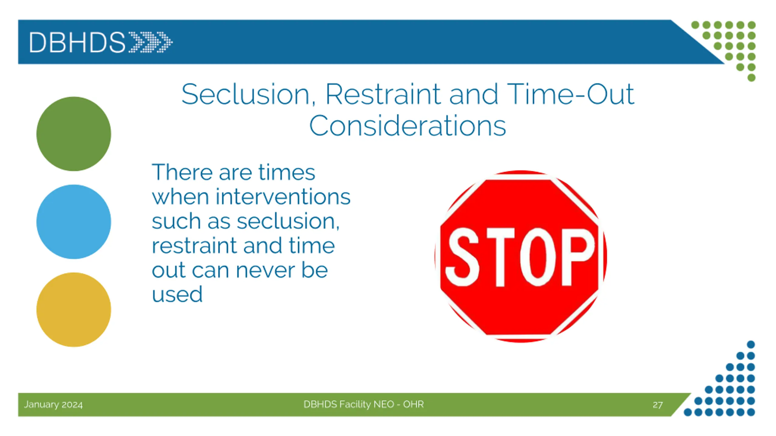 Seclusion, Restraint and Time-Out Considerations There are times when interventions such as seclusion, restraint and time out can never be used January 2024 DBHDS Facility NEO - OHR 27
