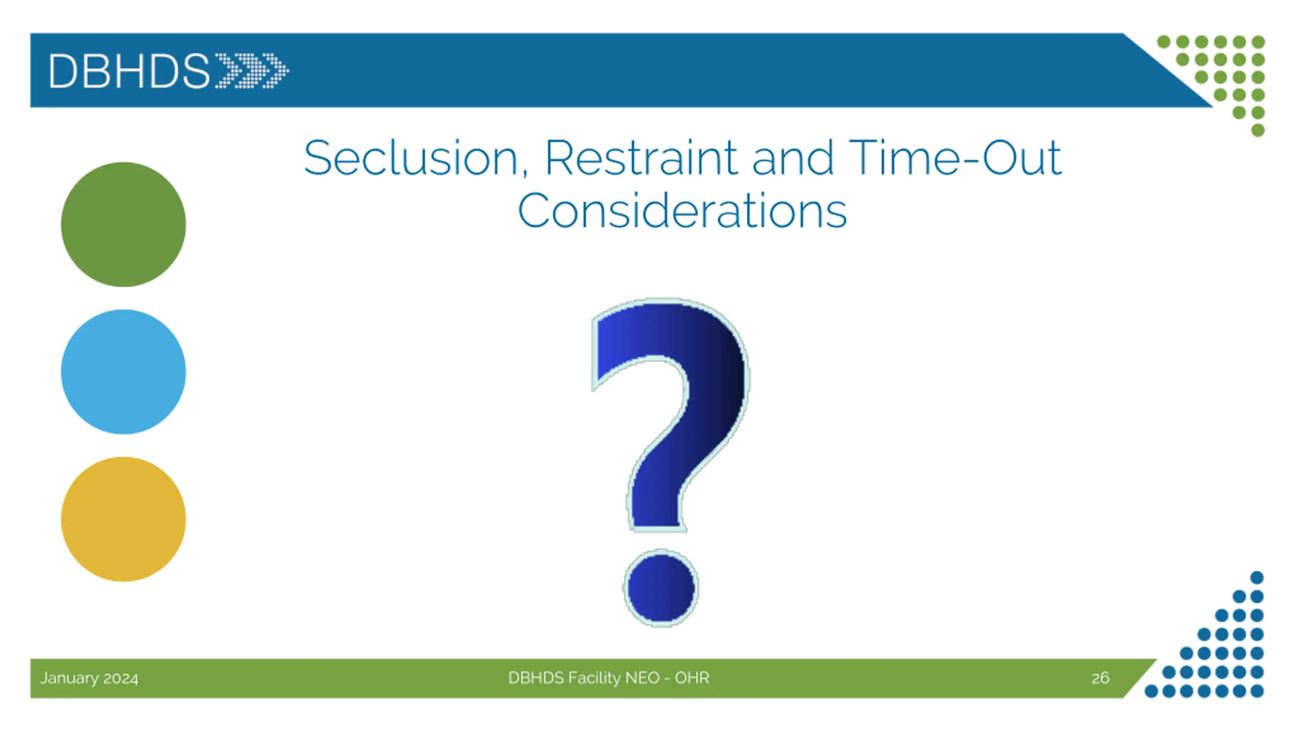 Seclusion, Restraint and Time-Out Considerations January 2024 DBHDS Facility NEO - OHR 26