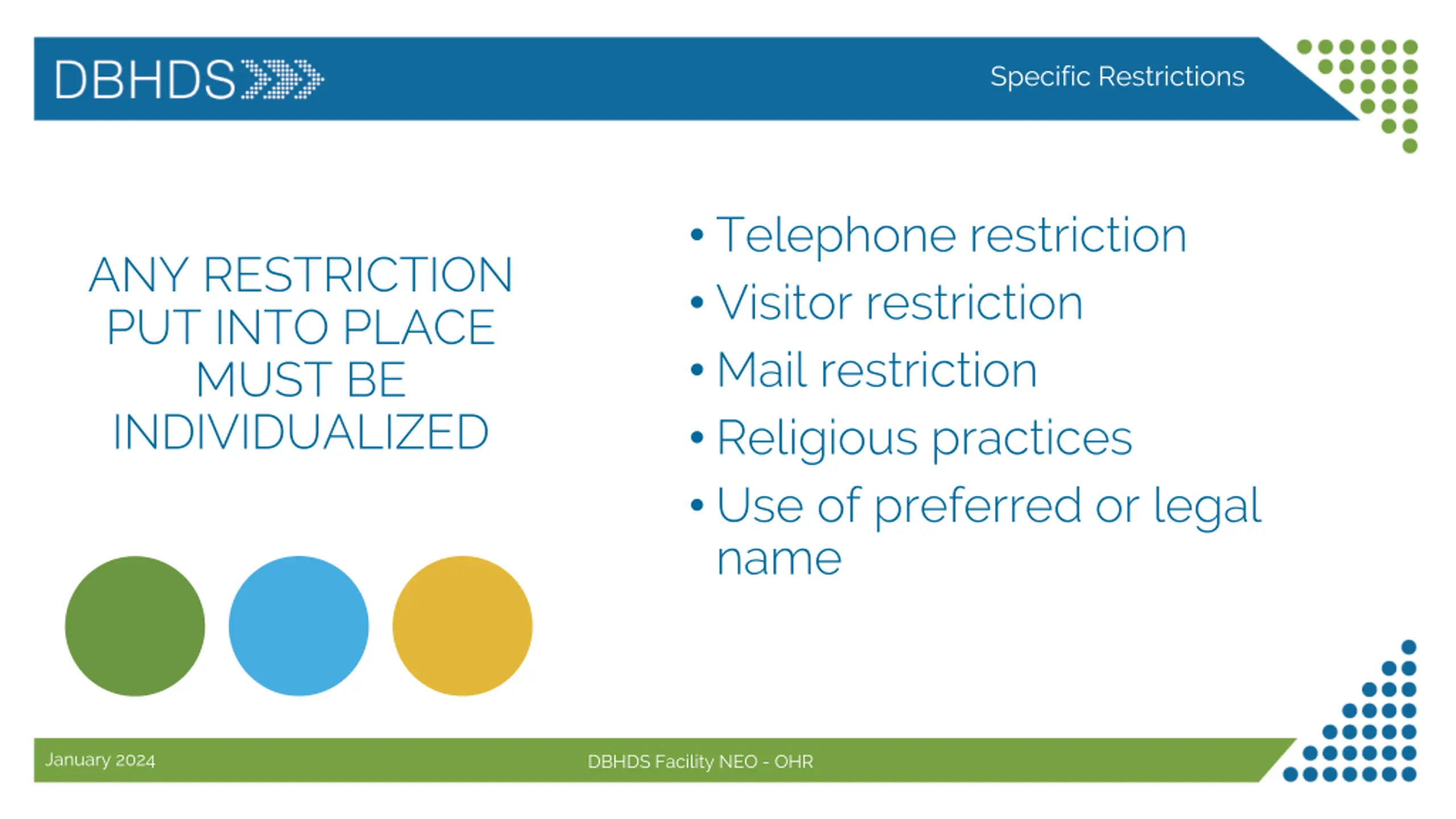 Specific Restrictions Telephone restriction Visitor restriction Mail restriction Religious practices Use of preferred or legal name ANY RESTRICTION PUT INTO PLACE MUST BE INDIVIDUALIZED January 2024 DBHDS Facility NEO - OHR
