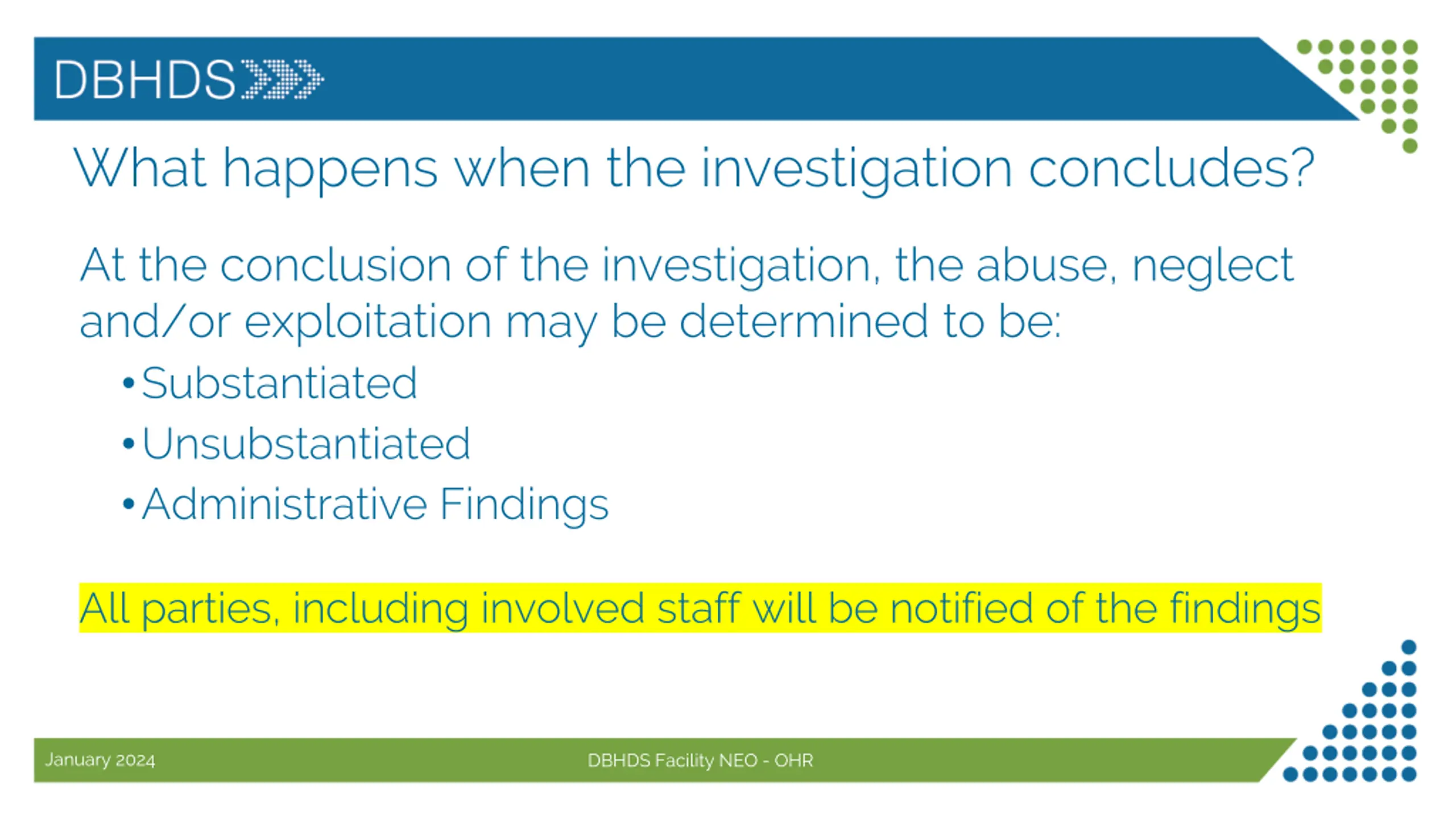 What happens when the investigation concludes? At the conclusion of the investigation, the abuse, neglect and/or exploitation may be determined to be: Substantiated Unsubstantiated Administrative Findings All parties, including involved staff will be notified of the findings January 2024 DBHDS Facility NEO - OHR