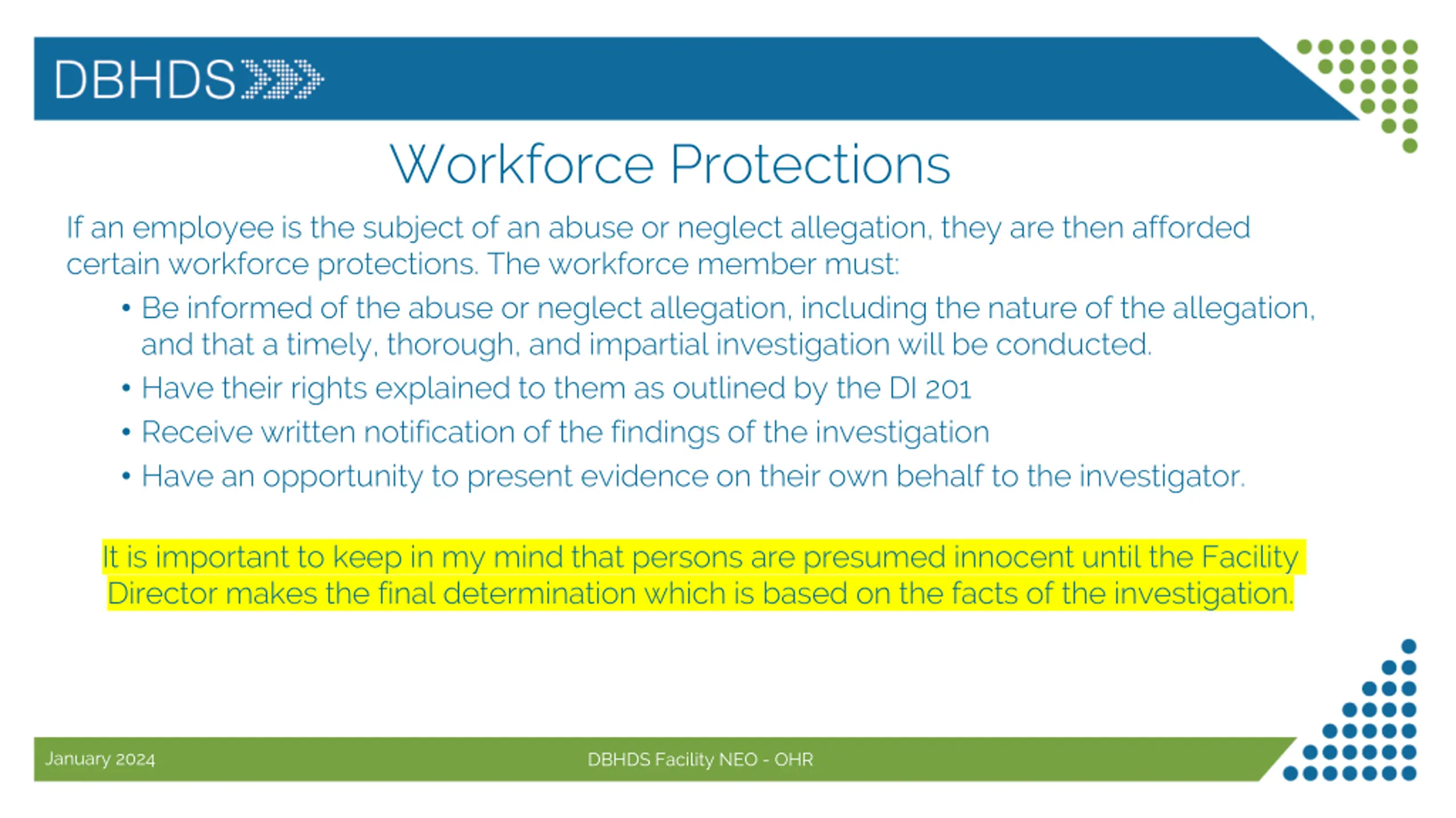 Workforce Protections If an employee is the subject of an abuse or neglect allegation, they are then afforded certain workforce protections. The workforce member must: Be informed of the abuse or neglect allegation, including the nature of the allegation, and that a timely, thorough, and impartial investigation will be conducted. Have their rights explained to them as outlined by the DI 201 Receive written notification of the findings of the investigation Have an opportunity to present evidence on their own behalf to the investigator. It is important to keep in my mind that persons are presumed innocent until the Facility Director makes the final determination which is based on the facts of the investigation. January 2024 DBHDS Facility NEO - OHR