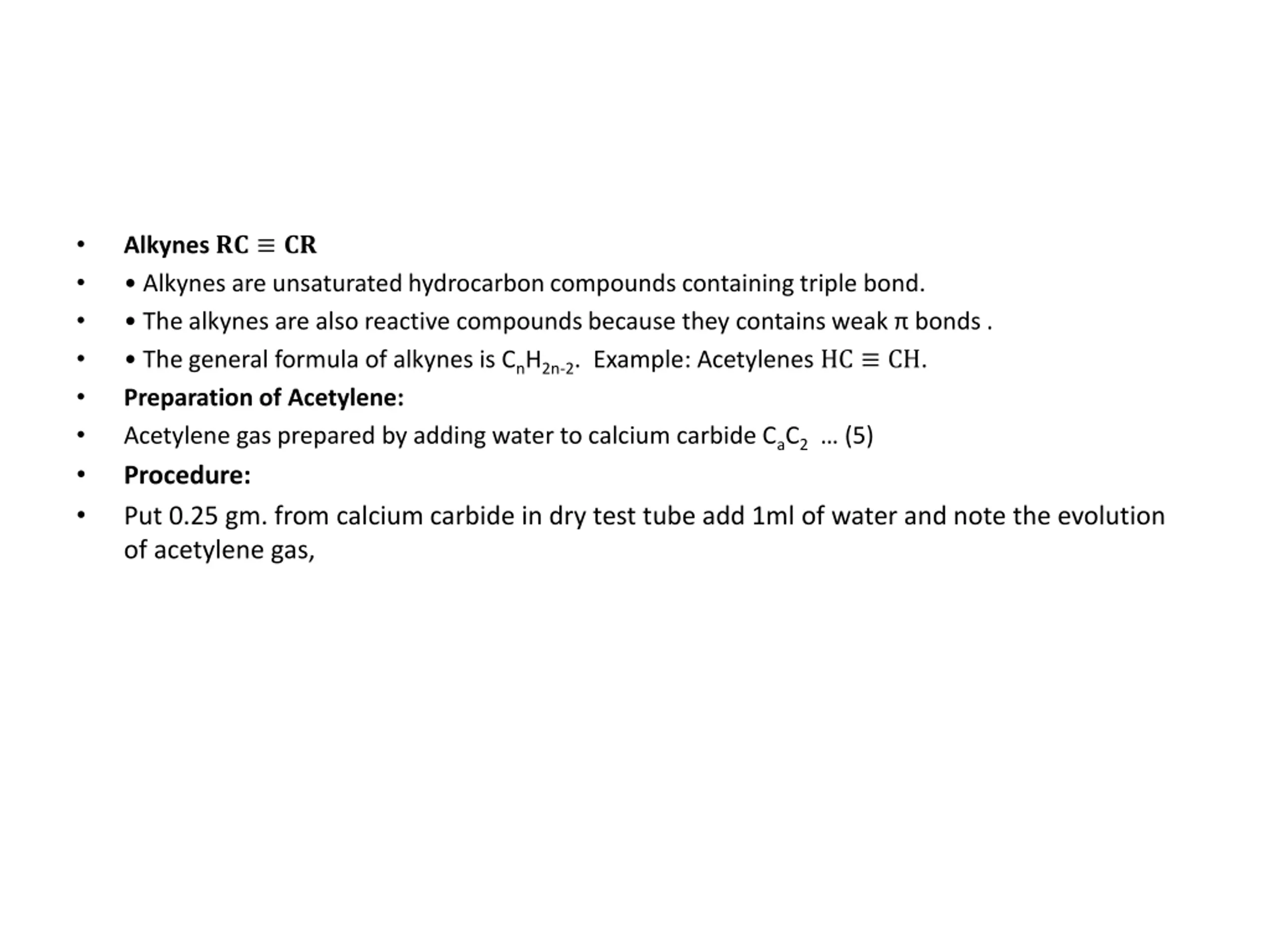 Alkynes ?? ?? Alkynes are unsaturated hydrocarbon compounds containing triple bond. The alkynes are also reactive compounds because they contains weak bonds . The general formula of alkynes is CnH2n-2. Example: Acetylenes HC CH. Preparation of Acetylene: Acetylene gas prepared by adding water to calcium carbide CaC2 (5) Procedure: Put 0.25 gm. from calcium carbide in dry test tube add 1ml of water and note the evolution of acetylene gas,