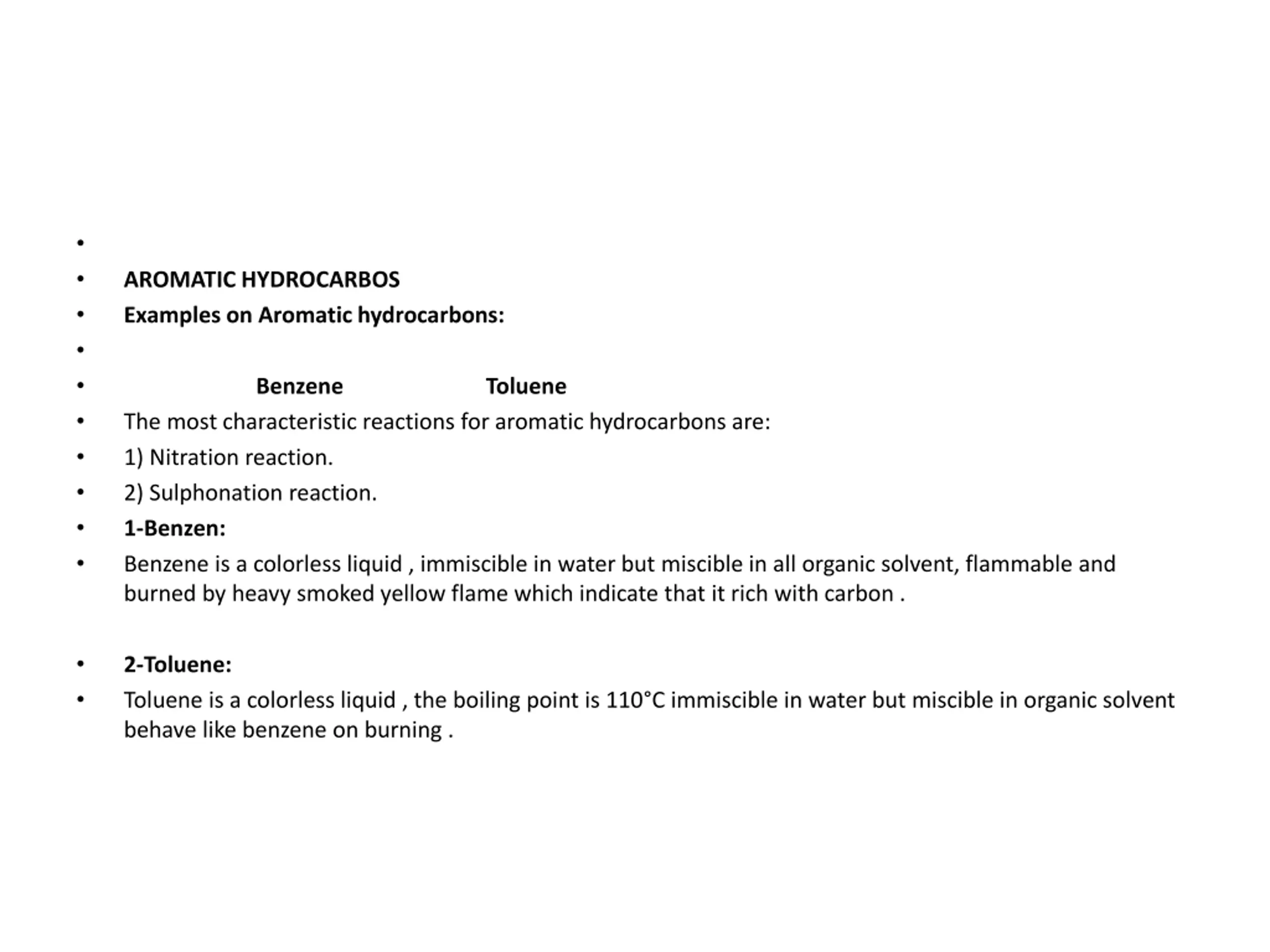 AROMATIC HYDROCARBOS Examples on Aromatic hydrocarbons: Benzene Toluene The most characteristic reactions for aromatic hydrocarbons are: 1) Nitration reaction. 2) Sulphonation reaction. 1-Benzen: Benzene is a colorless liquid , immiscible in water but miscible in all organic solvent, flammable and burned by heavy smoked yellow flame which indicate that it rich with carbon . 2-Toluene: Toluene is a colorless liquid , the boiling point is 110 C immiscible in water but miscible in organic solvent behave like benzene on burning .
