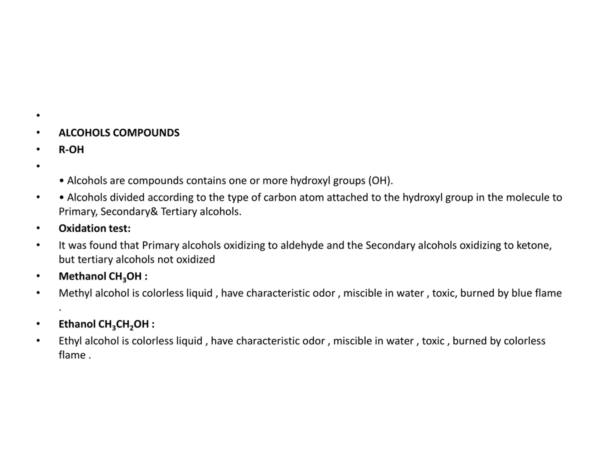 ALCOHOLS COMPOUNDS R-OH Alcohols are compounds contains one or more hydroxyl groups (OH). Alcohols divided according to the type of carbon atom attached to the hydroxyl group in the molecule to Primary, Secondary& Tertiary alcohols. Oxidation test: It was found that Primary alcohols oxidizing to aldehyde and the Secondary alcohols oxidizing to ketone, but tertiary alcohols not oxidized Methanol CH3OH : Methyl alcohol is colorless liquid , have characteristic odor , miscible in water , toxic, burned by blue flame . Ethanol CH3CH2OH : Ethyl alcohol is colorless liquid , have characteristic odor , miscible in water , toxic , burned by colorless flame .