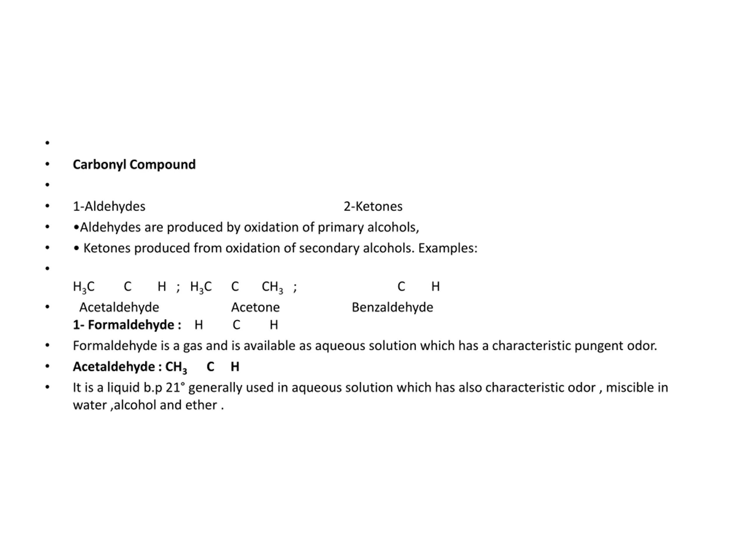 Carbonyl Compound 1-Aldehydes Aldehydes are produced by oxidation of primary alcohols, Ketones produced from oxidation of secondary alcohols. Examples: 2-Ketones H3C C H ; H3C C CH3; C H Acetaldehyde Acetone Benzaldehyde 1- Formaldehyde : H C H Formaldehyde is a gas and is available as aqueous solution which has a characteristic pungent odor. Acetaldehyde : CH3 C H It is a liquid b.p 21 generally used in aqueous solution which has also characteristic odor , miscible in water ,alcohol and ether .