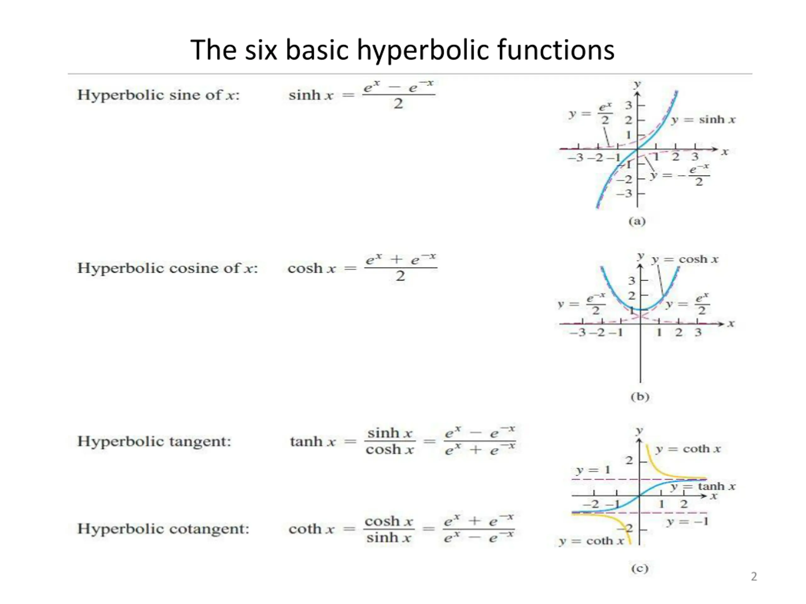 Explore the six basic hyperbolic functions in mathematics, including their definitions and properties. Visualize hyperbolic functions with informative slides depicting their characteristics and applications within mathematics.
